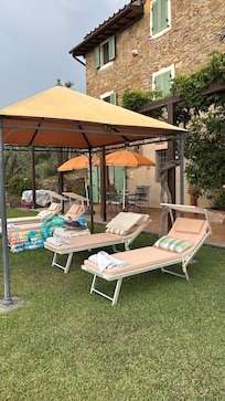 La maison, meublĂ©e avec style et Ă©quipĂ©e de tout confort, est la partie d'un chalet situĂ©e sur les collines de la municipalitĂ© de Massarosa, prĂšs des plages de la Versilia, elle est idĂ©ale pour passer d'agrĂ©ables vacances en toute tranquillitĂ© en famille ou entre amis. A votre arrivĂ©e le long de la route privĂ©e qui mĂšne au parking, vous profiterez immĂ©diatement d'une vue splendide sur la mer, le lac et les Ăźles. La maison est structurĂ©e comme suit: au rez-de-chaussĂ©e, le salon se compose d'une cuisine avec table et chaises (deux chaises hautes pour enfants disponibles) et d'un salon avec ses splendides arcades et plafond en briques apparentes une poutres est un espace ouvert oĂč vous pourrez vous dĂ©tendre et vous consacrer Ă la lecture ... Le tout est complĂ©tĂ© par une salle de bain avec douche. A l'Ă©tage, l'espace nuit se compose d'une chambre double, d'une chambre avec deux lits simples avec possibilitĂ© de les transformer en 1 lit double et deux lits bĂ©bĂ© sont Ă©galement disponibles. Ces chambres meublĂ©es d'armoires, tables de chevet, en bois et marbre, lits en fer forgĂ©, rappellent les plafonds des poutres avec la maison toscane classique. Le tout est complĂ©tĂ© par une salle de bain avec douche. Le jardin Ă©quipĂ© d'une piscine hors sol privĂ©e, (OUVERT DU 23/05/2026 au 11/10/2026) gazebo, transats, offre Ă nos hĂŽtes la possibilitĂ© de se dĂ©tendre loin du chaos de la ville, mais toujours proche de toutes les commoditĂ©s (SupermarchĂ©s , Restaurants, bars, banques, bureau de poste, boutiques, plages ...) La pergola suggestive avec table et chaises vous permet de dĂ©jeuner et de dĂźner en plein air en utilisant le barbecue pour de fabuleux barbecues, en dĂ©gustant un bon verre de vin ou en faisant une agrĂ©able apĂ©ritif passer des moments de dĂ©tente en plein air avec un panorama enchanteur. Disponible pour l'amusement des petits, jeux de plein air ..(chaise berçante, toboggan, table avec chaises) et pour les plus ĂągĂ©s une toute nouvelle table de baby-foot et de ping-pong. La maison dispose d'une place de parking avec deux places de parking Ă cĂŽtĂ© de la structure et d'un porte-vĂ©los. Cette charmante propriĂ©tĂ© est entourĂ©e d'oliviers, dont nous obtenons une excellente huile que nous serons heureux de vous offrir Ă votre arrivĂ©e. Bref, pour des vacances faites de dĂ©tente mais aussi de plaisir, soleil, mer, shopping, balades nature, ... ce gite est idĂ©al pour vos vacances. Nous serons heureux de vous accueillir et de vous aider tout au long de votre sĂ©jour, nous vous fournirons des informations utiles pour pouvoir vous dĂ©placer dans la rĂ©gion avec facilitĂ© et tranquillitĂ©, suggĂ©rant des endroits Ă visiter avec des dĂ©tails particuliers, des sports Ă pratiquer et tout ce dont vous avez besoin. Nous vous attendons en Toscane! La connexion Internet et la consommation d'Ă©nergie liĂ©e Ă l'eau, l'Ă©lectricitĂ© et le gaz sont incluses dans le prix. Le nettoyage final s'Ă©lĂšve Ă 110,00 euros. Le dĂ©pĂŽt de 350,00 euros doit ĂȘtre versĂ© Ă l'arrivĂ©e en espĂšces.