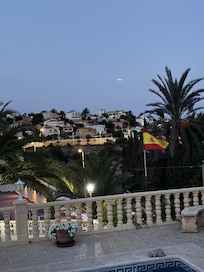 La piscine offre une vue sur le Peñón de Ifach, une piscine rectangulaire 3X6, 4 chaises longues pour bronzer, et une douche extérieure.