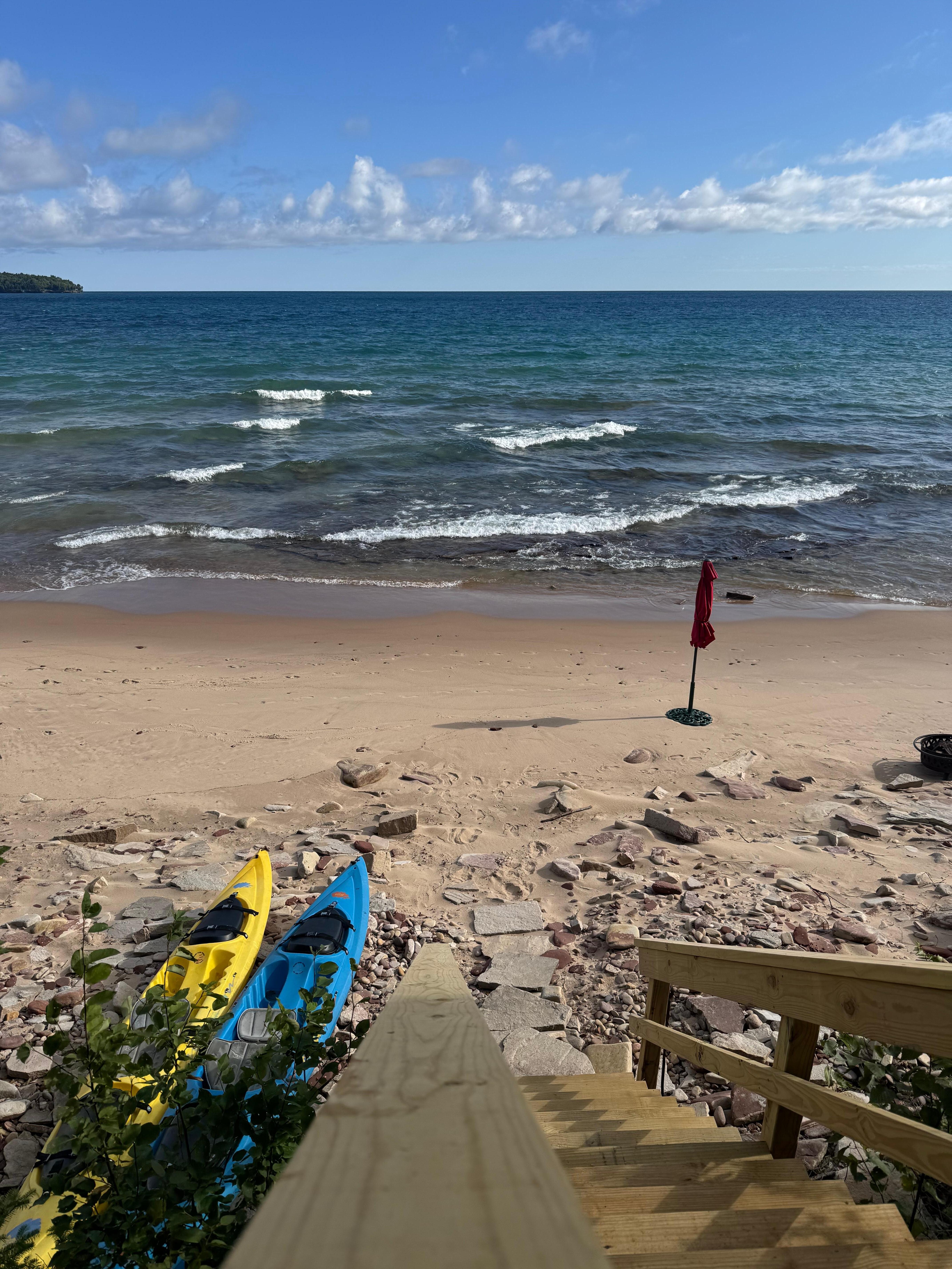 Il s'agit d'un spacieux appartement de plain-pied de 800 pieds carrés. Il est situé sur les rives du magnifique lac Supérieur et se trouve à quelques pas seulement de la plage. Parasol et chaises, foyer et bois, table de bistrot en plein air, barbecue Weber au charbon sont fournis. L'appartement dispose d'une cuisine efficace et d'une entrée privée avec votre clé personnelle.