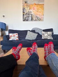 â A comfy living room with a flat-screen TV