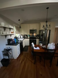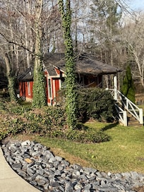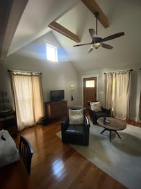 Il y a deux chambres. Une avec un lit King, une avec un lit double et un canapé-lit avec matelas en mousse à mémoire de forme dans la piÚce à vivre. Le parking de la maison se trouve à gauche de la maison avec des marches latérales menant au porche. Deux voitures peuvent tenir dans cet endroit