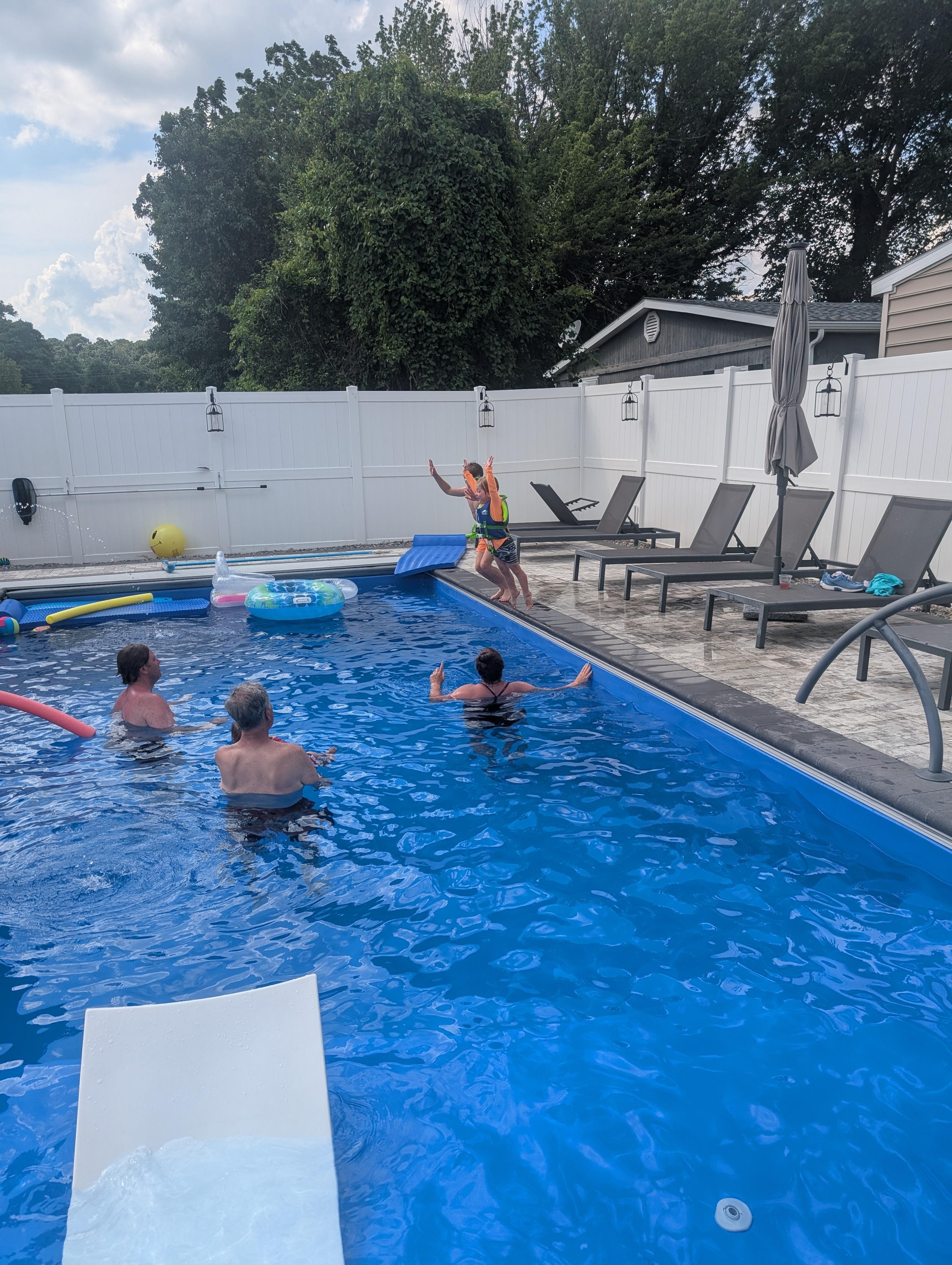 We were the grandparents with our sons and grandchildren, ages 1 1/2 -7. The pool was certainly the highlight for all the kids and something we enjoyed every afternoon. It was wonderful to finally have a dining table large enough to accommodate all 13 of us. By far the best equipped house we've ever rented. From kitchen items to games and even some toiletries. That said, the only condiments were salt and pepper. No sugar or oil. I don't know if items like dish and laundry detergent were left by previous renters or supplied, but even though I brought those items, it was nice to find them there as we did run out of laundry detergent. I love to pay it forward and left items as well.We loved the two separate living rooms as we could put the kids in the basement and have it a little quieter upstairs! The porch was a favorite spot for a cup of coffee in the morning or card games after the kids were in bed. Was also a great place to sit and watch the rain.A negative is there's no ac in the bunk rooms so you have to rely on the ceiling and floor fans.With young kids in our party it would have been nice if there were upper locks on the doors to prevent the little ones from going outside and accessing the pool. Our rental last summer had them and we greatly appreciated it. That said, we just kept a close eye on them.Also, so you're not taken by surprise, know that the view from the porch isn't a scenic one. We knew that going in so not a big deal for us.