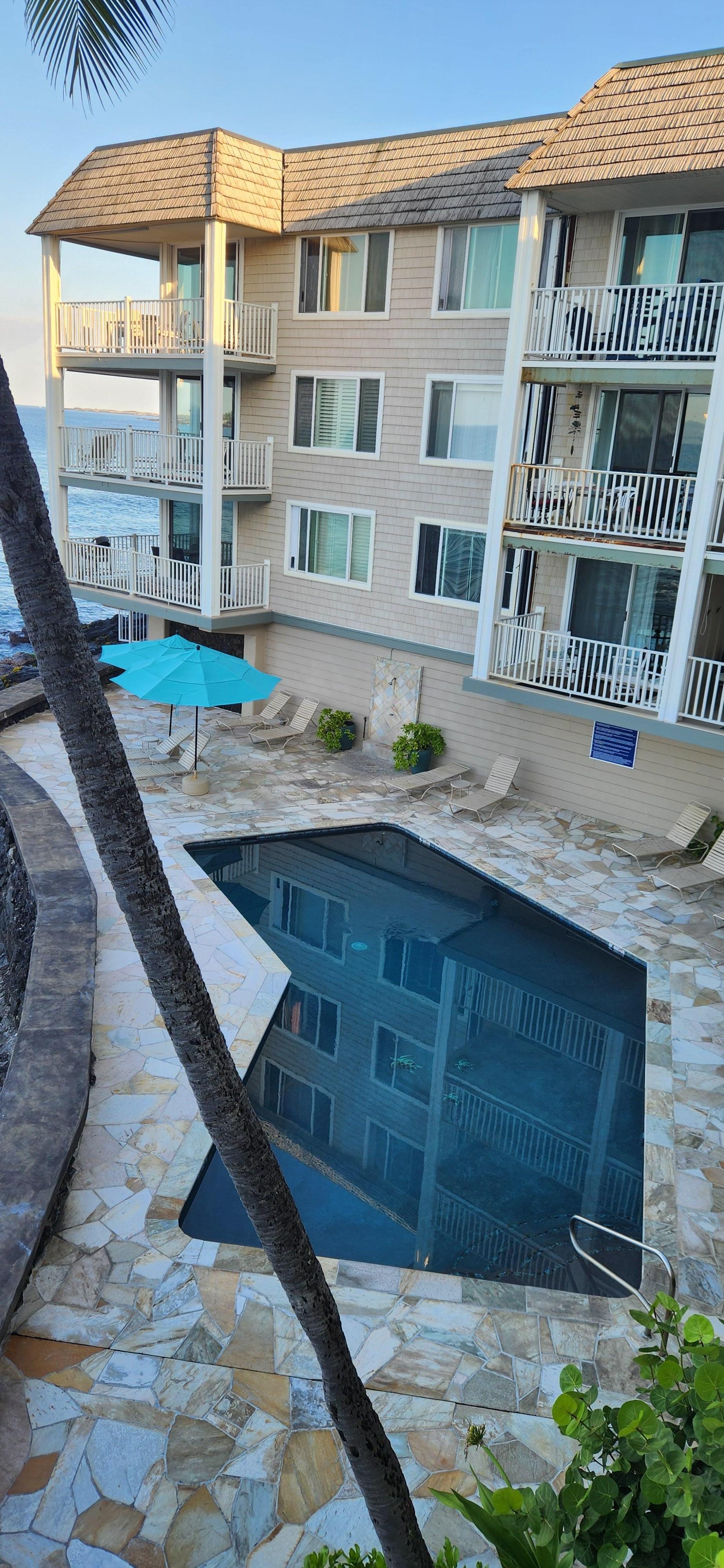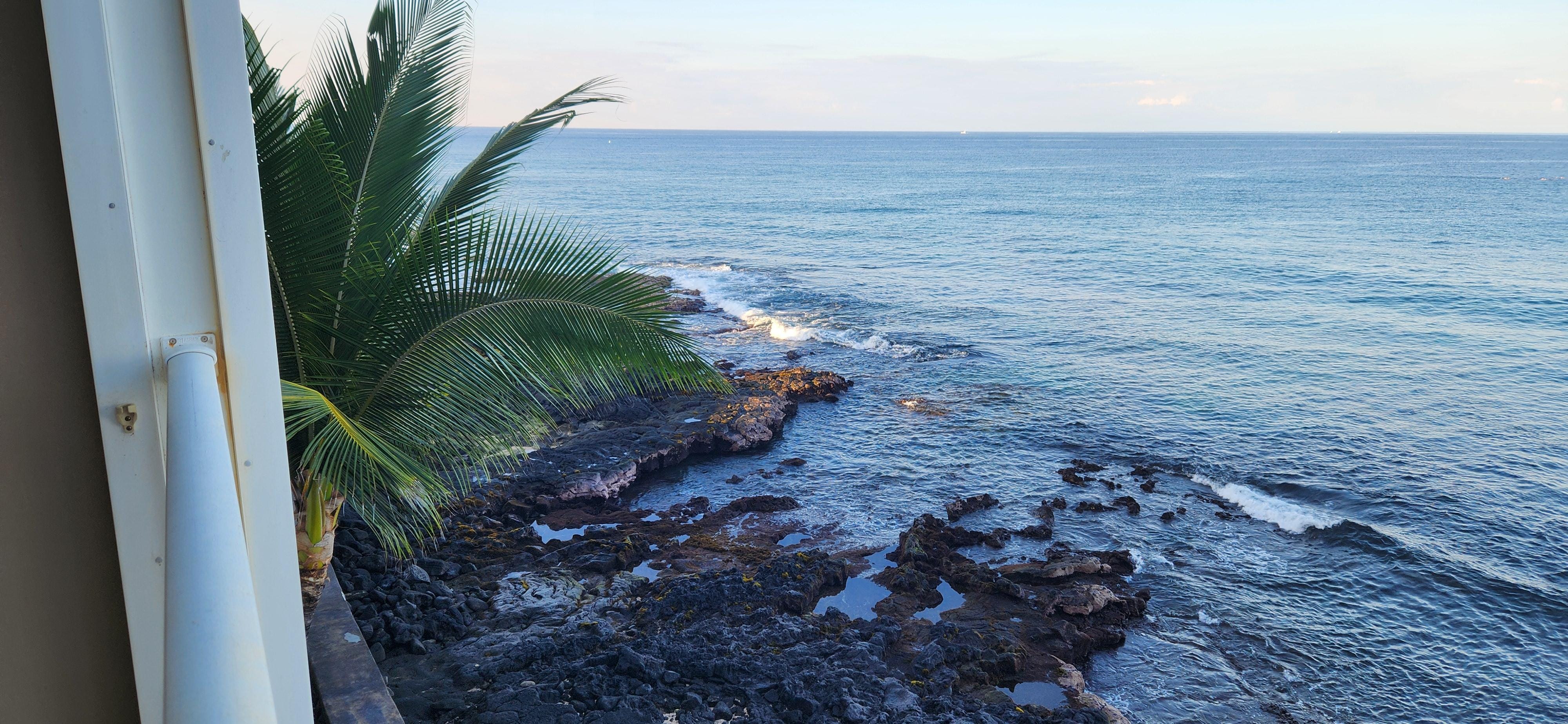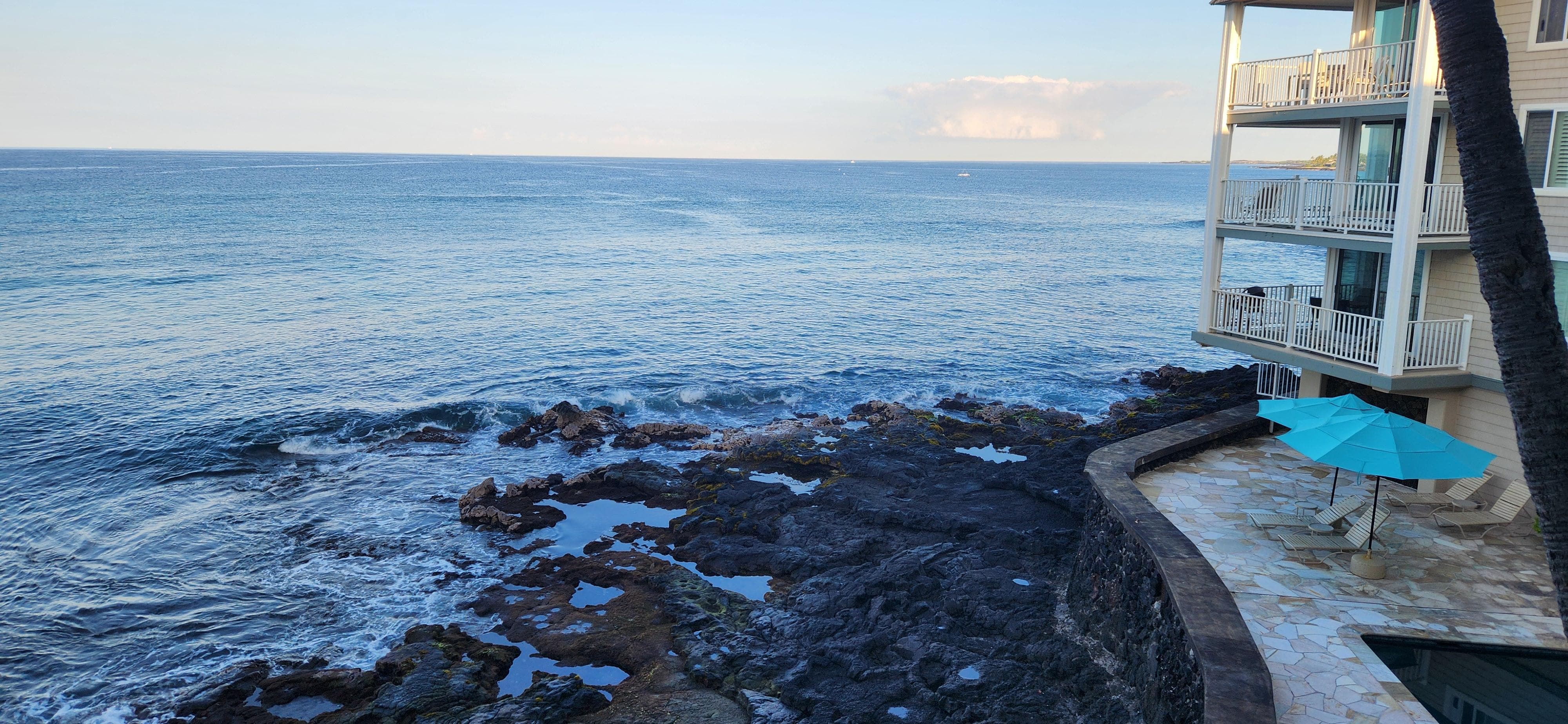 Hale Kona Kai est un petit complexe de 3 douzaines de condos en bord de mer absolue en ville mais hors des sentiers battus! Situé dans une rue calme (75-5870 Kahakai Road) et juste une courte distance de marche du village de Kailua-Kona également connu comme Kona Town. L'Hale Kona Kai est à seulement 1 pùté de maisons de la plage de sable blanc de Honl et à 2 pùtés de maisons du marché des fermiers de Kona.