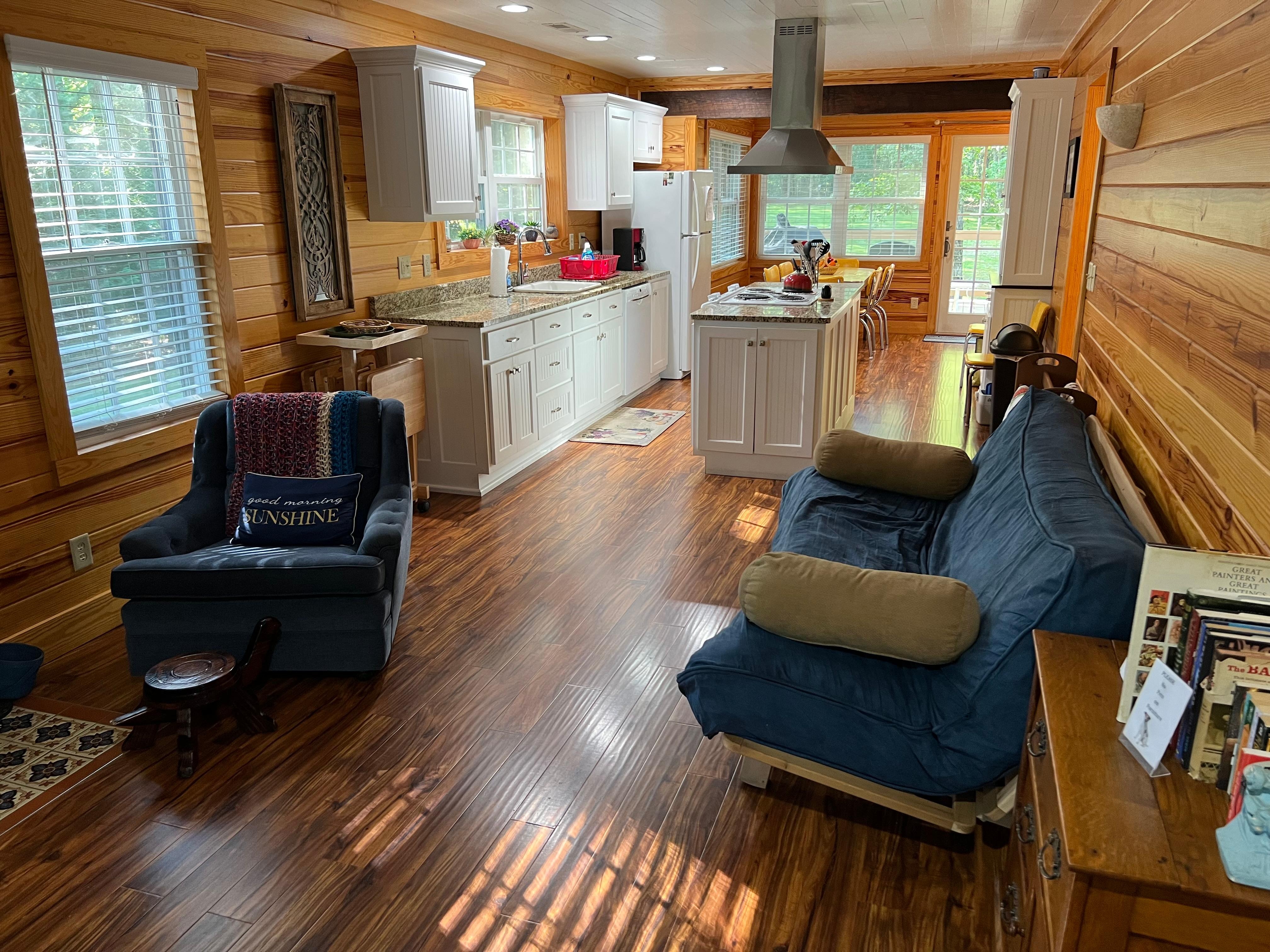 Un accueil lumineux et joyeux vous attend dans ce chalet confortablement confortable. EntiÚrement rénové à partir des étalons en 2018, Sunshine Cottage dispose de 2 chambres avec salle de bains complÚte. Le salon a un lit de repos avec gigogne. Le salon à aire ouverte mÚne à une grande terrasse à l'arriÚre donnant sur les bois et une prairie agrémentée d'un ruisseau humide. La grande cour latérale est parfaite pour les enfants à courir et jouer et dispose d'un foyer extérieur. Une promenade de 2 minutes dans le calme, impasse rue vous amÚne au pont sur la riviÚre avec votre propre trou de natation (profondeur moyenne de 4 1/2 à 5 pieds, pas de plongée!) compléter avec une coupe naturelle pour lancer votre kayak.