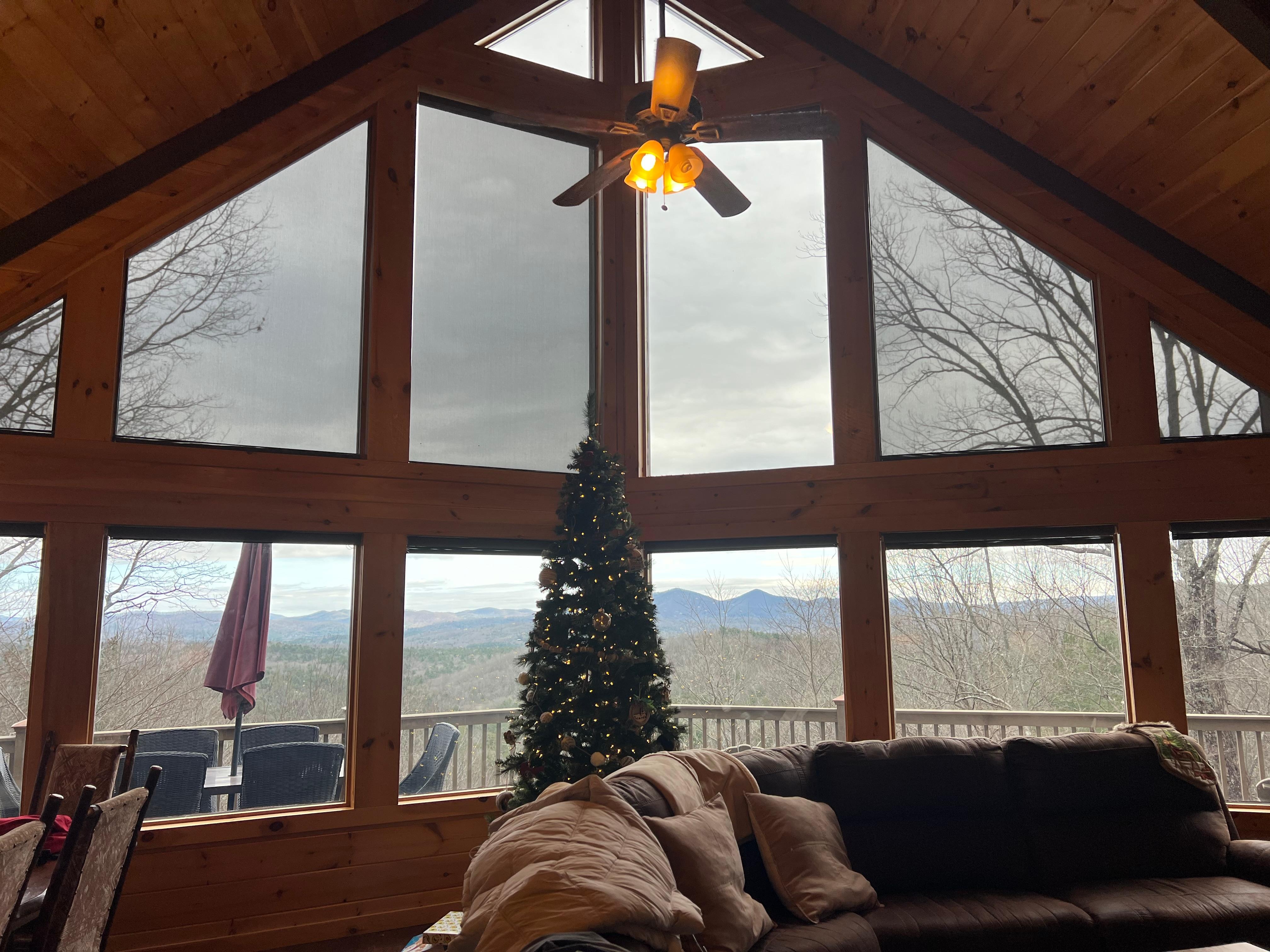 Le salon / salle à manger ouvert offre une vue sur la montagne d'un mur à l'autre, un haut plafond tentaculaire et une cheminée en pierre confortable. Détendez-vous simplement et profitez de la vue, le coucher et le lever du soleil est vraiment à couper le souffle.
