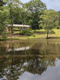 Belle maison de style ranch, située dans un cadre boisé. Ambiance trÚs décontractée. Belle vue sur l'étang. L'allée traverse le barrage de l'étang jusqu'à la maison. L'entrée se fait par le carport et dans la cuisine. L'Internet. Salle de bain a une cabine de douche. Master bain a combo baignoire / douche. Maßtre et une autre chambre ont des lits queen. Deux lits jumeaux dans la troisiÚme chambre. Le salon a un canapé avec des fauteuils d'extrémité et 2 bascules / fauteuils inclinables.