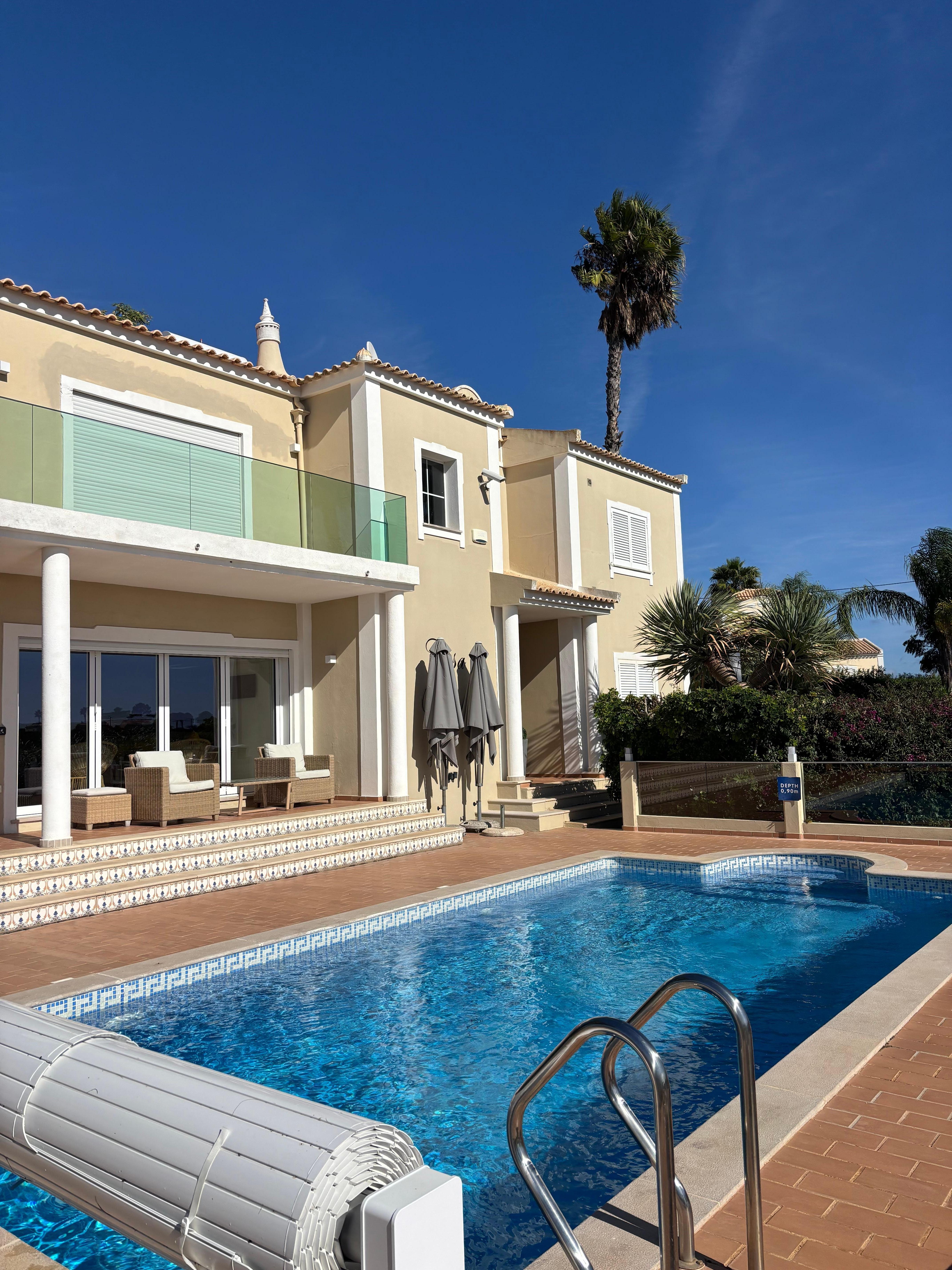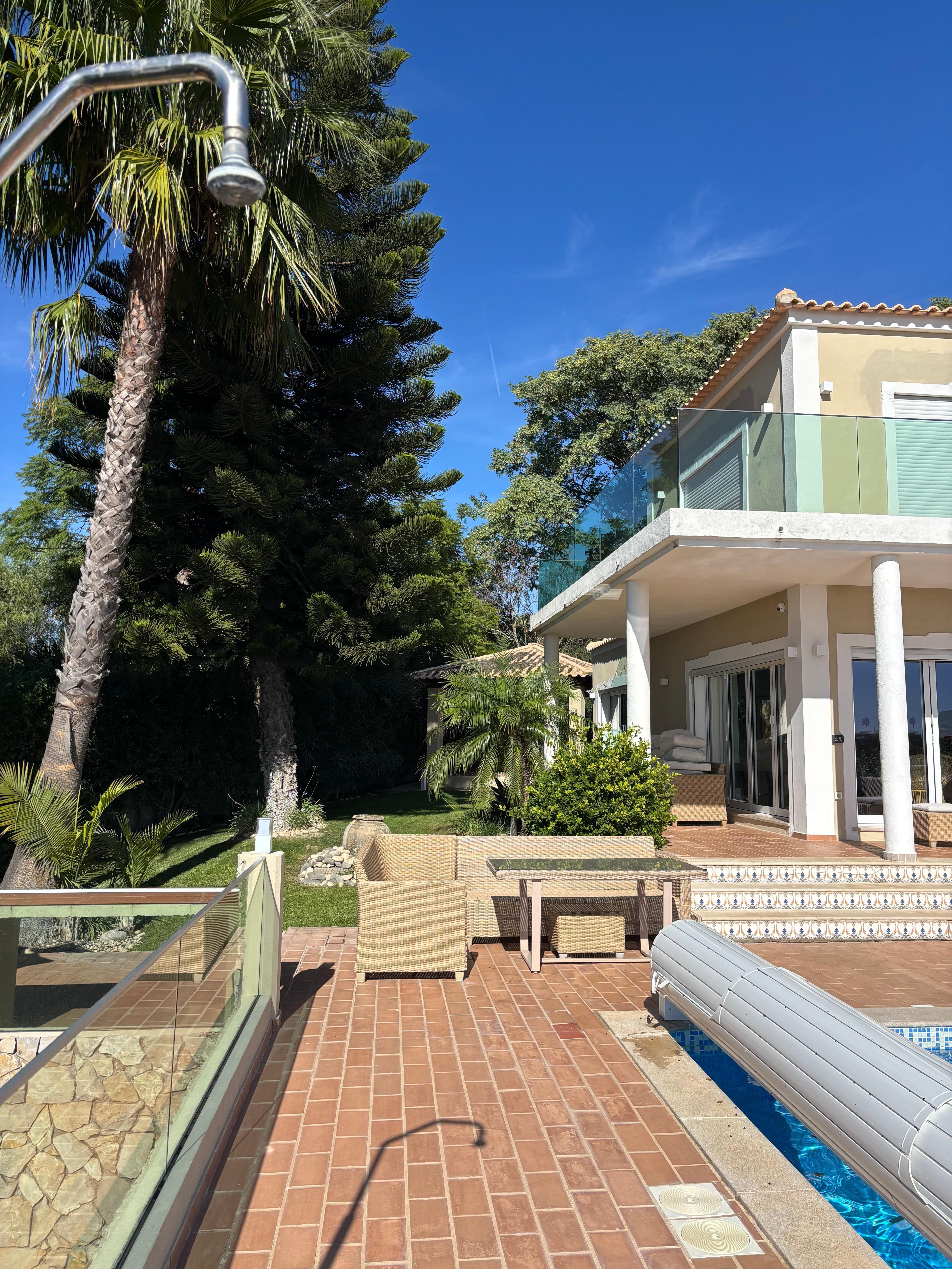 This exclusive luxury villa is located just above Loule in a relaxing countryside location with both country & coastal views. This 4 bed villa sleeps 8 and has 2 shower rooms and 2 bathrooms with air con throughout.The villa is set on a 3000mts plot with 2 electric gates, High speed fibre internet with 1 Gbps download speed, landscape gardens complete with a walk in heated pool it also has a childrenâs play area.The property has a games room with an arcade machine with 3000 games' pool table, table tennis football tennis, machine,dart board,Wii,PS4,, 50 inch TV with Meo tv etc.The property has a large spacious living area with a state of the art kitchen and a 75 inch LCD TV complete with DVD players, Sky TV package includes; movies; sports channels.Bedrooms have 32' TV'S MEO tv package with childrenâs channels.The kitchen area inside the villa is finished to a high standard & comes equipped with all modern appliances. An outside fridge is situated by the BBQ area for alfresco dining. There is a fifth bedroom which is owners apartment this is closed and not for rental.