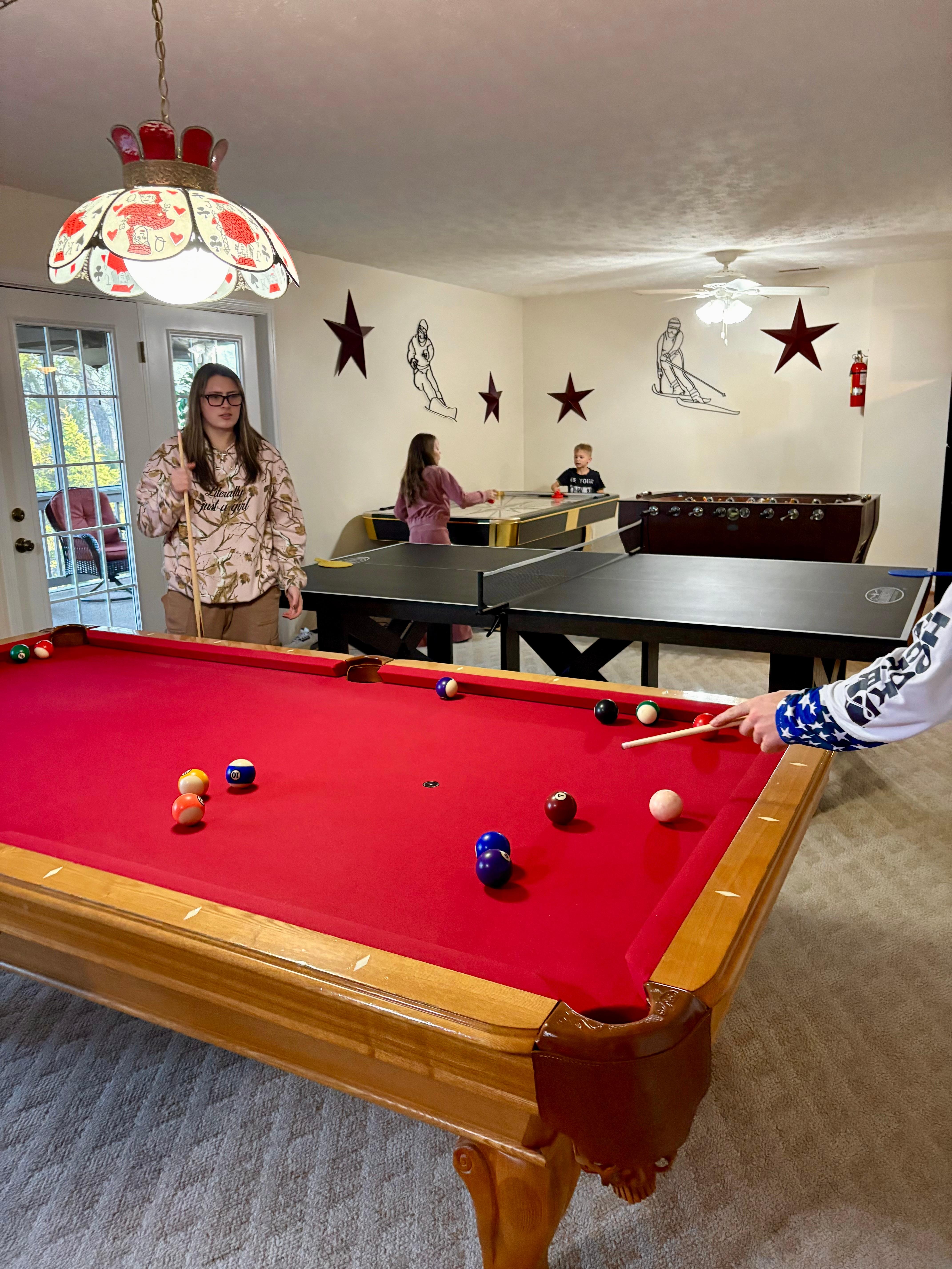 La plus grande salle de jeux à Massanutten. Table de billard en ardoise Brunswick, ping-pong, baby-foot, air hockey Shadow Turbo. Toutes les tables de jeu sont de taille réglementaire. Jeux de société. Mini cuisine avec réfrigérateur et micro-ondes. Caché dans le pont inférieur avec des meubles en osier et un ventilateur dans la salle de jeux.