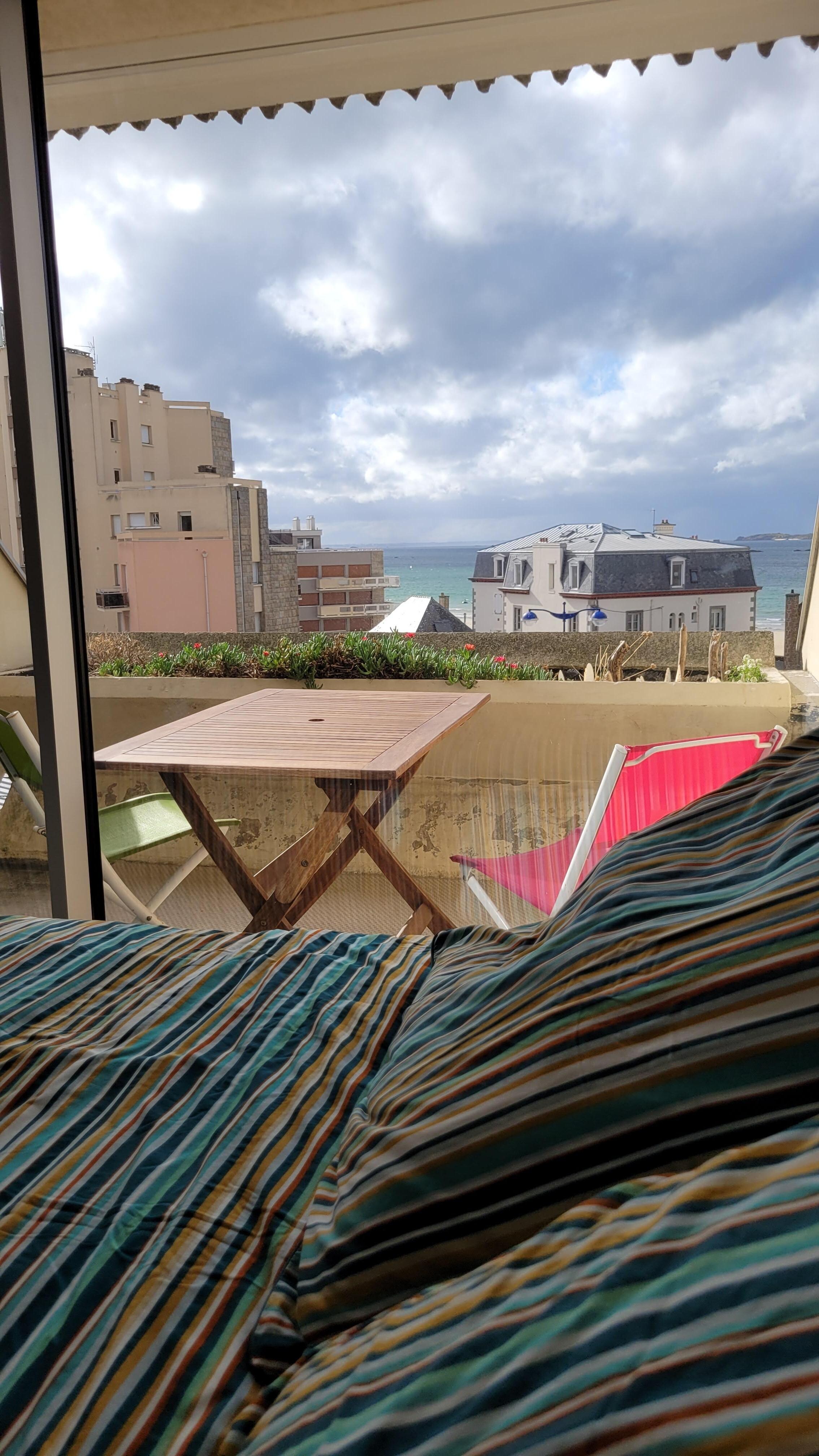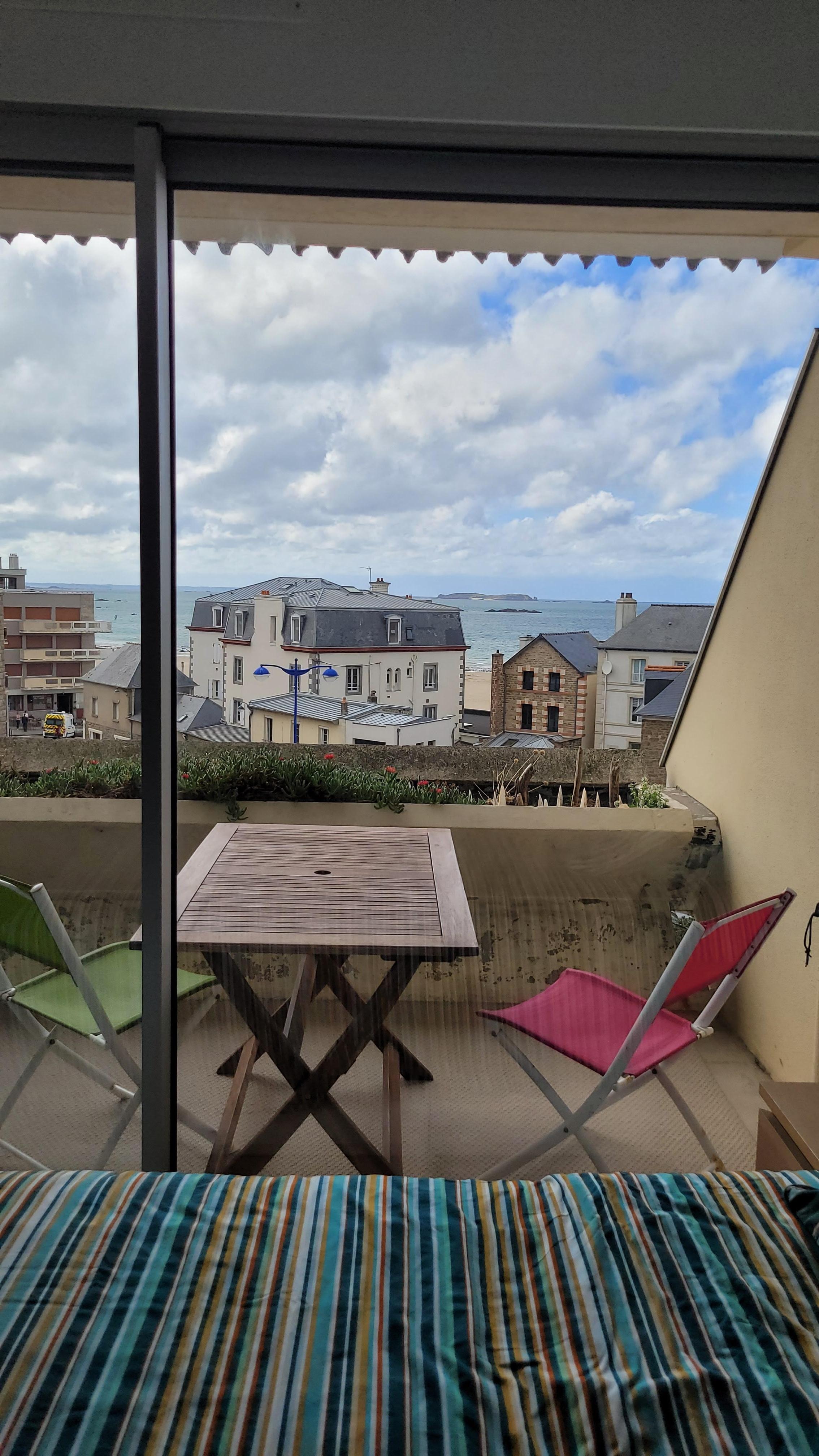 Au 3Úme étage d'un bel immeuble avec ascenseur du quartier Rochebonne, proche de tout et à 2 pas de la plage et des ballades en bord de mer, tous commerces, studio lumineux refait neuf, tout confort, wifi, trÚs belle vue mer comprenant un lit neuf trÚs confortable, cuisine équipée pour cuisiner avec lave-vaisselle, machine Nespresso, petit électro-ménager, internet wifi et Tv, balcon-loggia pour prendre le soleil et manger à l'abri du vent et des regards. Plage, tous commerces, laverie, activités nautiques et bus à 50m, thalasso à 10minutes a pieds par le bord de mer. Non fumeur et pas d'animaux. Parking gratuit autour de la résidence, local pour les vélos dans l'immeuble.