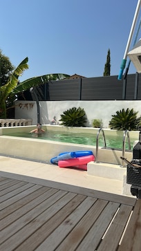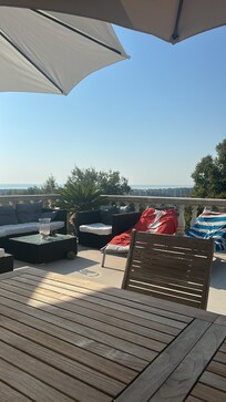 La vue est superbe et la piscine privée sur la terrasse, ainsi que la présence de chaises longues et de trois grands parasols, sont un vrai plus pour des aprÚs-midi/soirées détendues et conviviales.