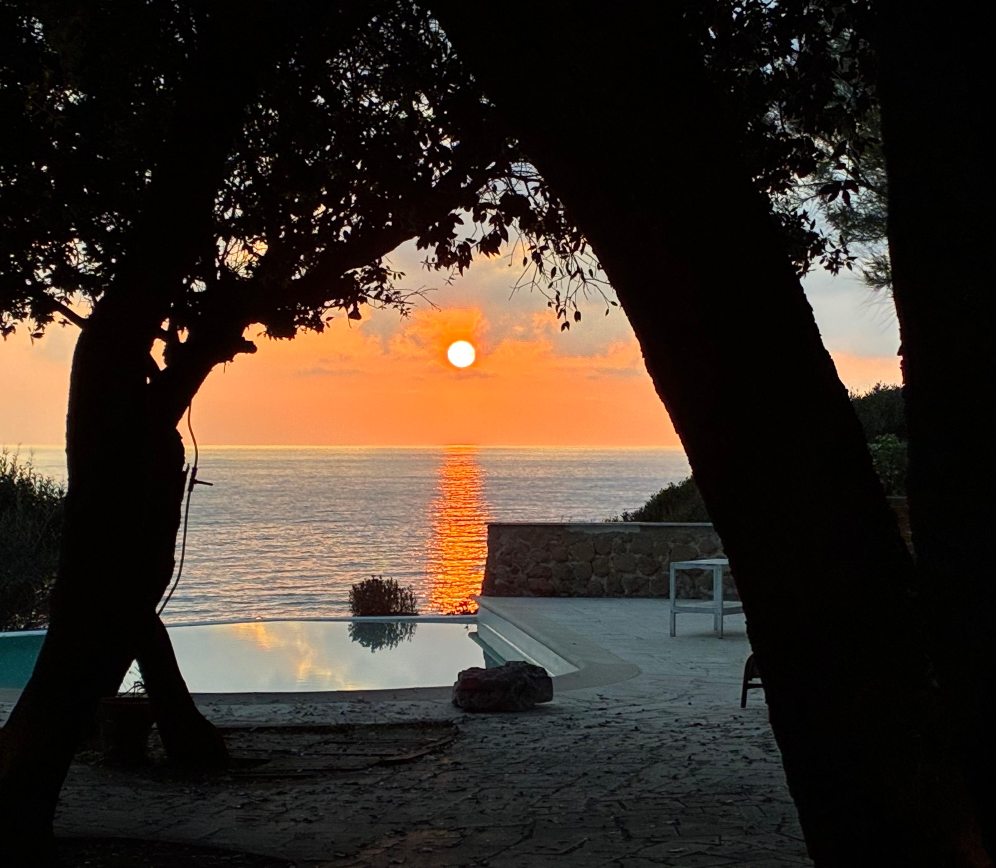 L'espace extĂ©rieur est complĂ©tĂ© par une grande terrasse ensoleillĂ©e avec vue sur la mer d'oĂč, tout en sirotant un apĂ©ritif assis dans le salon en rotin, vous pourrez admirer les magnifiques couchers de soleil.