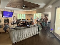 L'espace de vie principal de cette location de vacances à Palm Desert comprend trois chambres, une cuisine de chef, plusieurs salles à manger, un grand salon avec un billard et un wet-bar, un coin salon avec un baby-foot et un patio avec un salon extérieur pour se détendre et profiter de la vue.