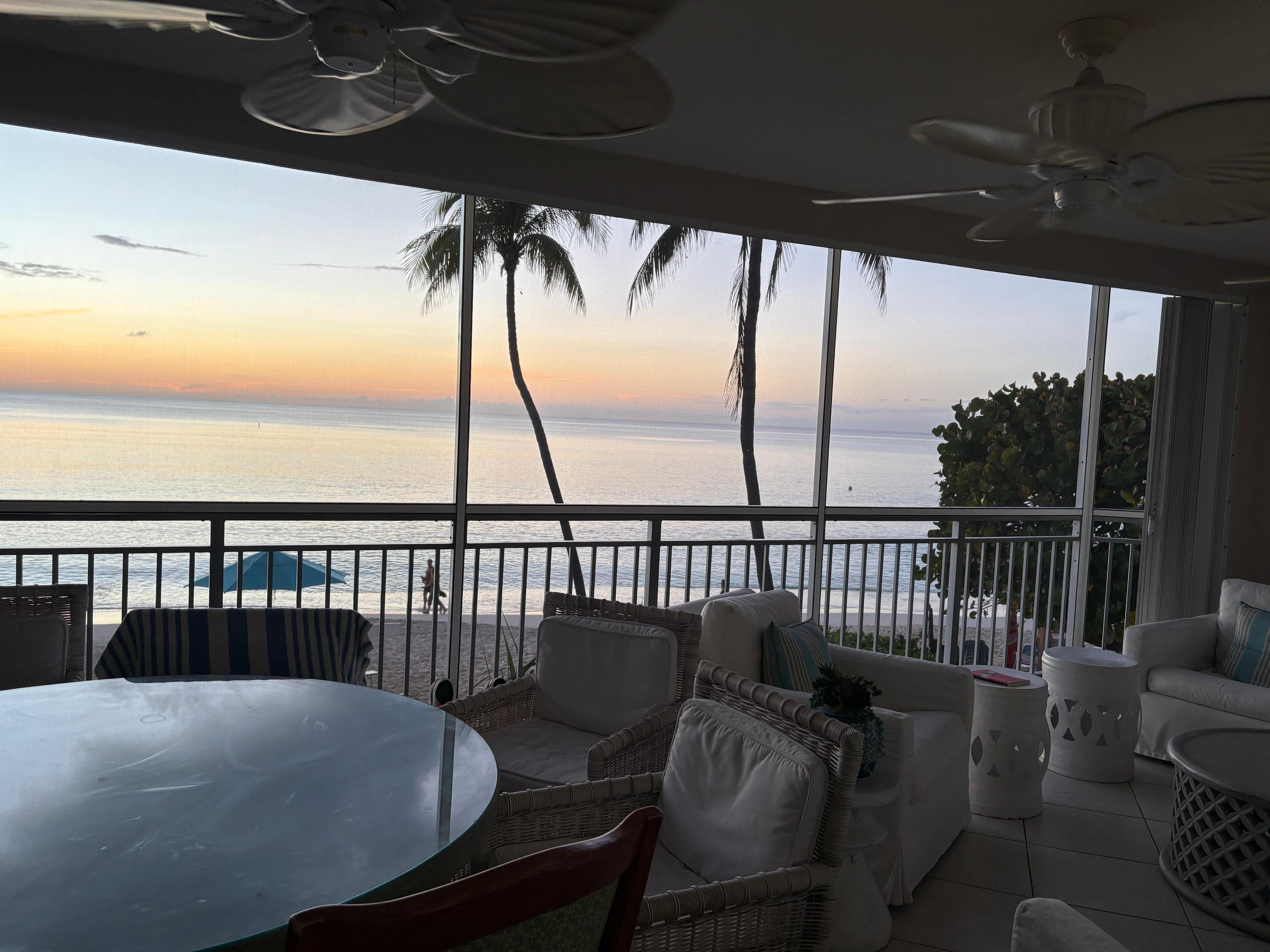 ⹠Grand porche grillagé avec des siÚges confortables, des ventilateurs de plafond et une vue panoramique sur l'océan