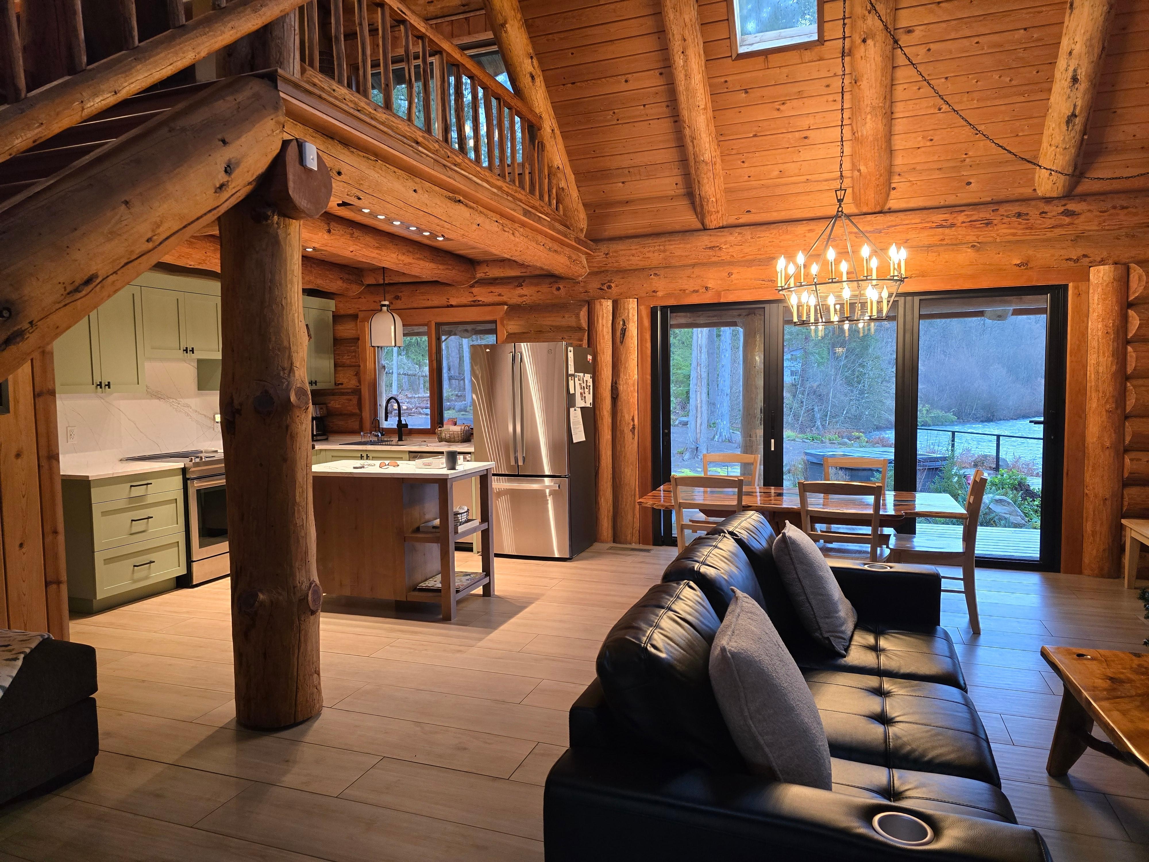 The Riverside Retreat sleeps up to 6 guests with two bedrooms, each with a king and a pull out queen sleeper sofa in the great room. The primary bedroom upstairs offers one with a king bed and a childrenâs nook with games and activities. There is a king bed in the downstairs bedroom.