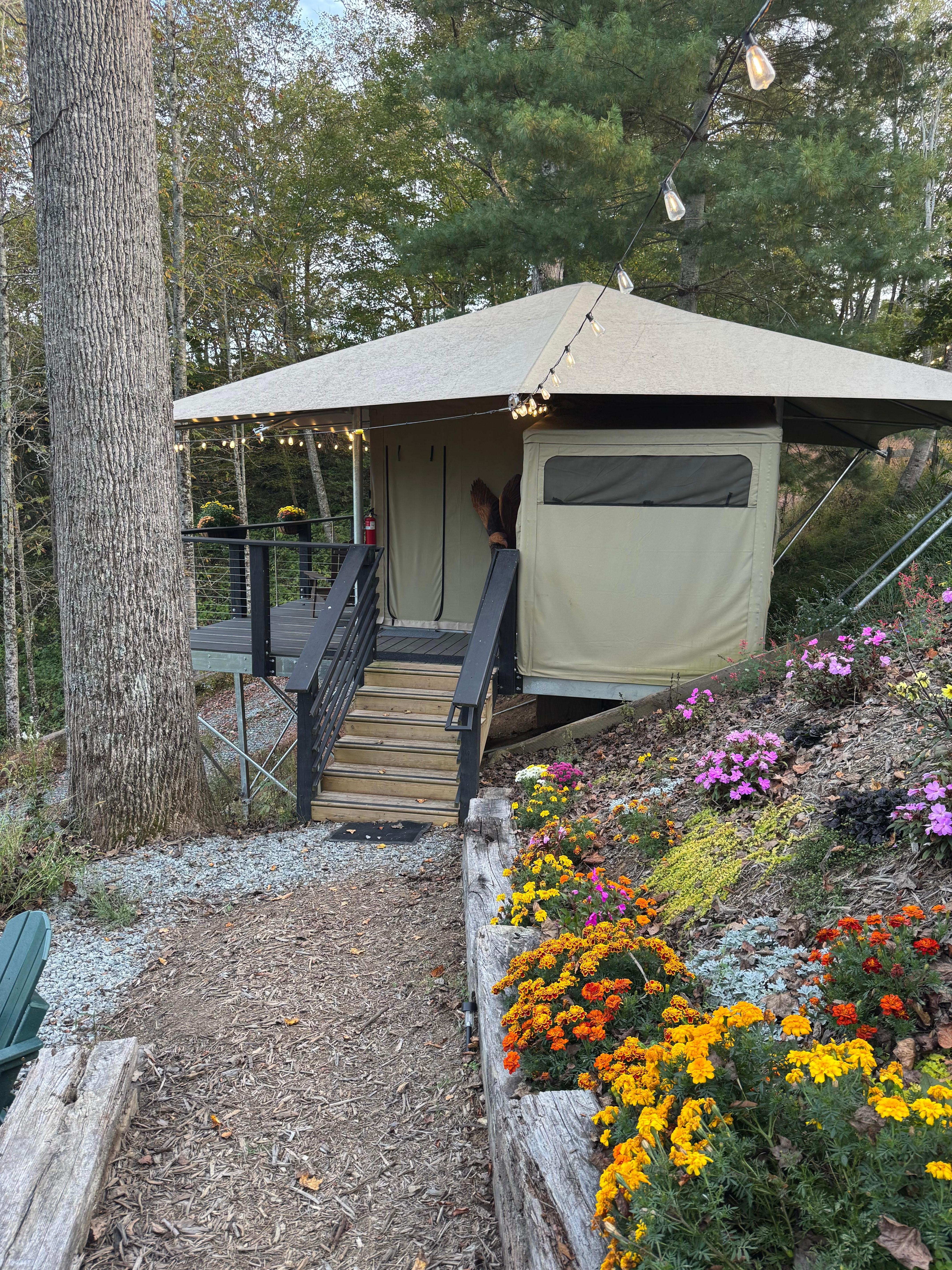 Experience the great outdoors, no roughing it required! This 1-bedroom, 1-bath vacation rental offers all the fun of camping â canvas walls, fresh air, and fireflies at night â with none of the hassle. Wake up to sunrise views from bed, then start the day with coffee on the deck. Hike the local trails, explore Booneâs small-town charm, or tour the 150-year-old farm. Ready to unplug without giving up a hot shower? This glamping tent makes it easy.