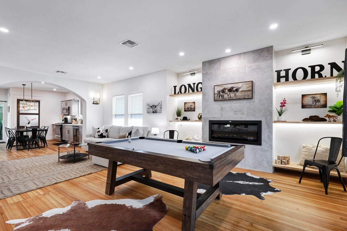 This stylish San Antonio home offers the perfect mix of comfort and fun. Located minutes from downtown, it features a cozy living area, a fully equipped kitchen with stainless steel appliances, and a game room with a pool table. Unwind on the charming front porch or enjoy quality time with friends and family inside. Ideal for weekend getaways, family vacations, or business trips, Longhorn has it all!