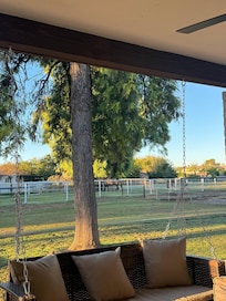 - Covered patio w/ dining area & swing