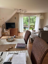 Vous avez la possibilitĂ© de dĂźner dans le salon Ă la table Ă manger. 5 confortables chaises en rotin sont disponibles. Le grand canapĂ© d'angle peut ĂȘtre retirĂ© en cas de besoin et une aire de jeux. En outre, nous avons maintenant un grand tĂ©lĂ©viseur Ă Ă©cran plat de 117 cm. WiFi est bien sĂ»r gratuit. Le salon donne sur le balcon qui est orientĂ© vers le sud-ouest. Il est Ă©quipĂ© de meubles de jardin et invite le barbecue d'Ă©tĂ©. Bien sĂ»r, il y a aussi un parasol.