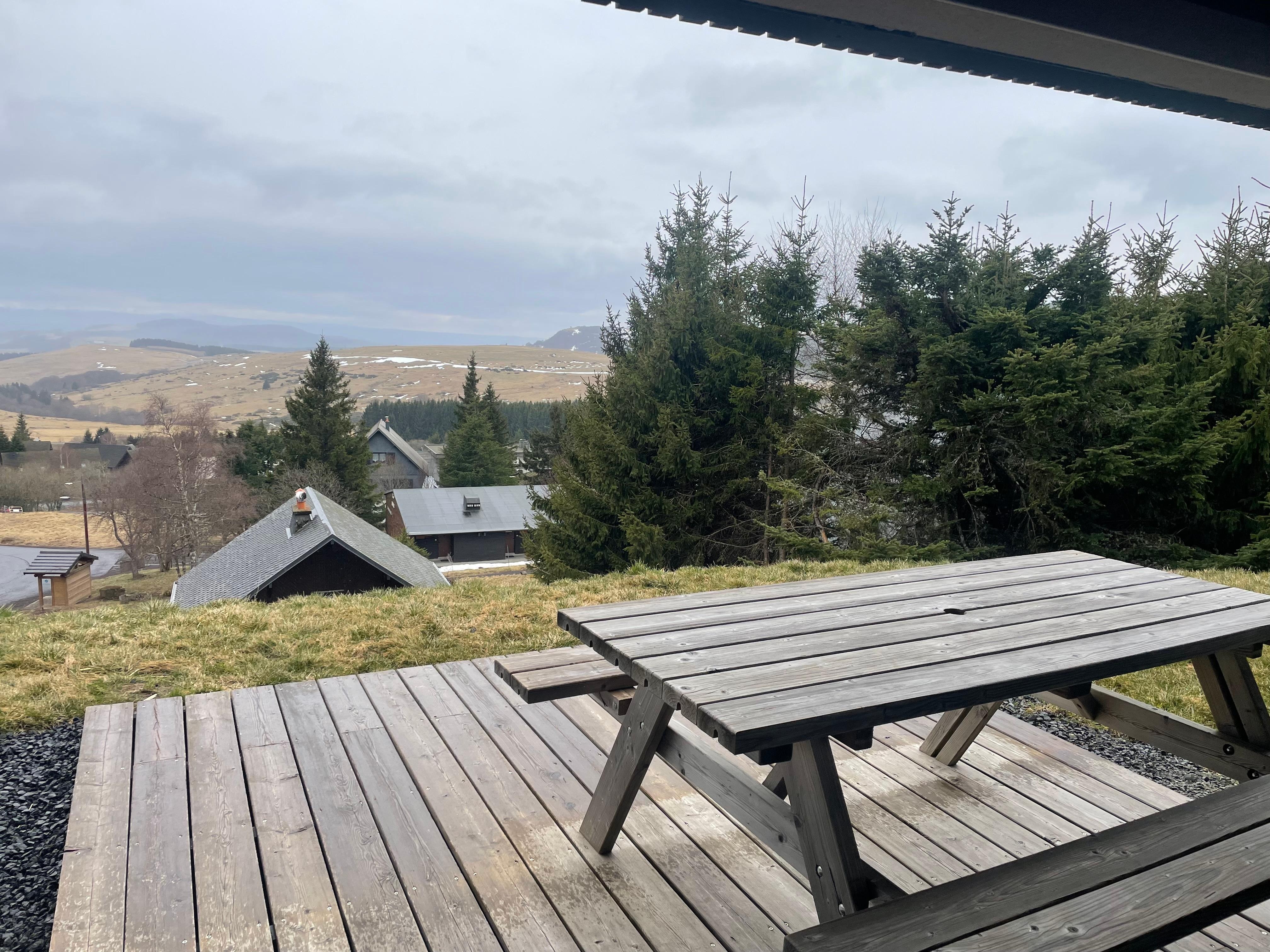Le chalet bĂ©nĂ©ficie dâune magnifique vue panoramique sur les monts dâAuvergne et sur le lac des Hermines.
