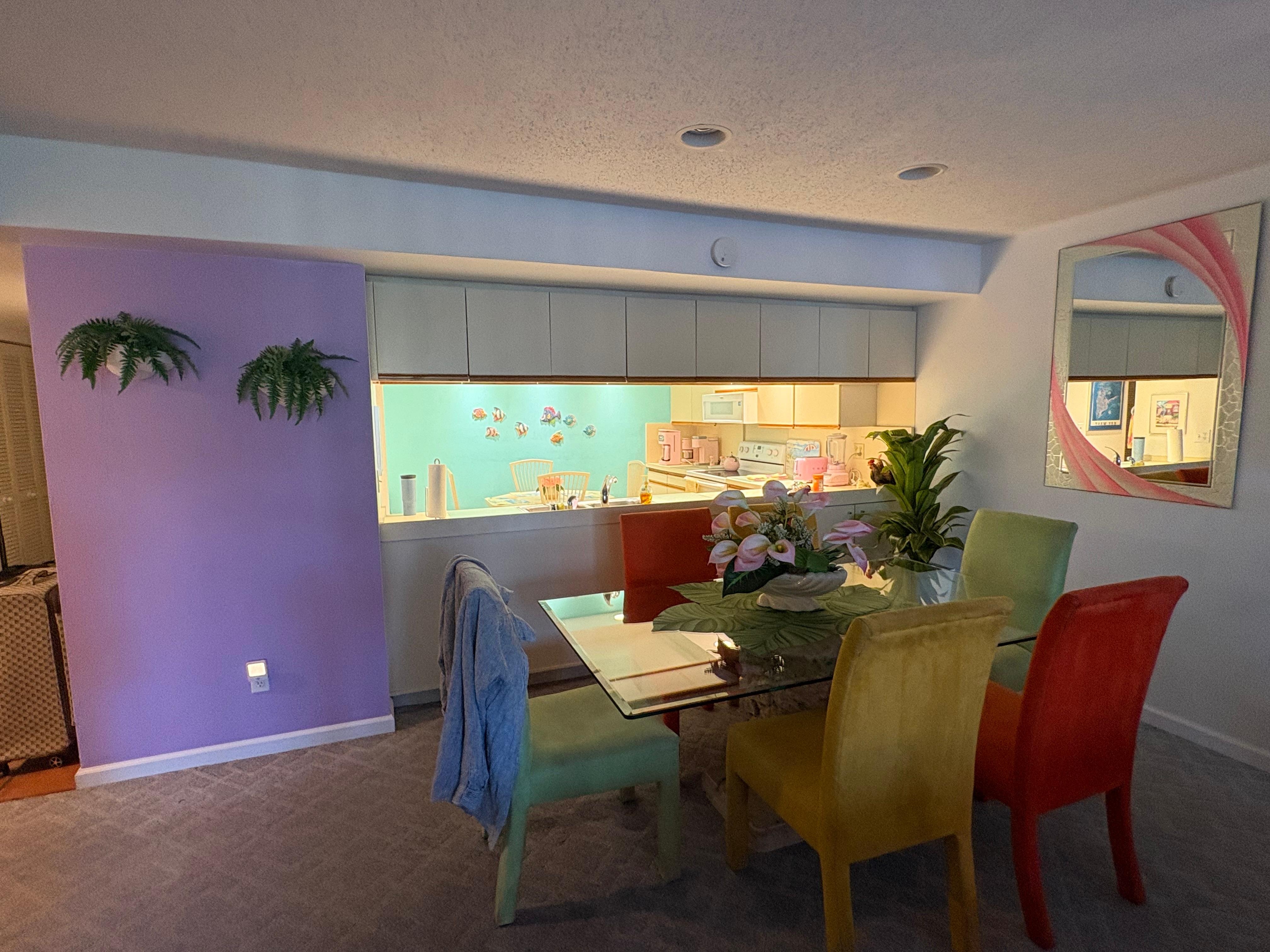 Negatives: the condo is outdated and feels like you are walking into Barbieâs Grandmas 80âs Florida decor condo. Everything is pink- I mean everything! And then mix in some pirate decor and it is a bit overwhelming. Even the bedspreads are outdated. The coffee cups are not microwaveable and you canât leave the door walls open which would have been nice with screens for the cooler nights. The air conditioning canât go lower than 70 (condo rule).