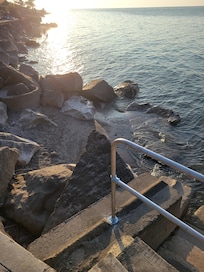 Outside is a small concrete patio with picnic tables, gas grill, and fire pit. Though the area is under renovation by another property owner so conditions cannot be guaranteed at any specific time, shared, private lake access is available at the end of our short street. Use is at your own risk. Guests choosing to visit the lakefront must provide their own beach towels, chairs, and water shoes (strongly recommended). We ask everyone to be considerate of others.