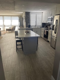 Absolutely, amazing condo! Open floor plan is spacious and perfect for entertaining, with brand new leather sectional, camel colored leather recliner, cozy chair and 65â Smart TV/DVD. This beautifully decorated condo is a 2 spacious bedrooms and 2 full baths with all new glassed -in showers installations. Upon the entry is the new remodeled kitchen with all new stainless appliances, quartzite countertops and cabinets with inset lights. Plenty of countertop space, quartz island (with built in charger) with 6 leather stools. Just off the kitchen is a large dining table for 6 people.The master bedroom has a king bed size with new comfort top mattress, two nightstands, 6 Drawer Dresser and a beautiful modern height adjustable desk. A spacious powder room connected to the bedroom, a large closet and a luxurious full bathroom.