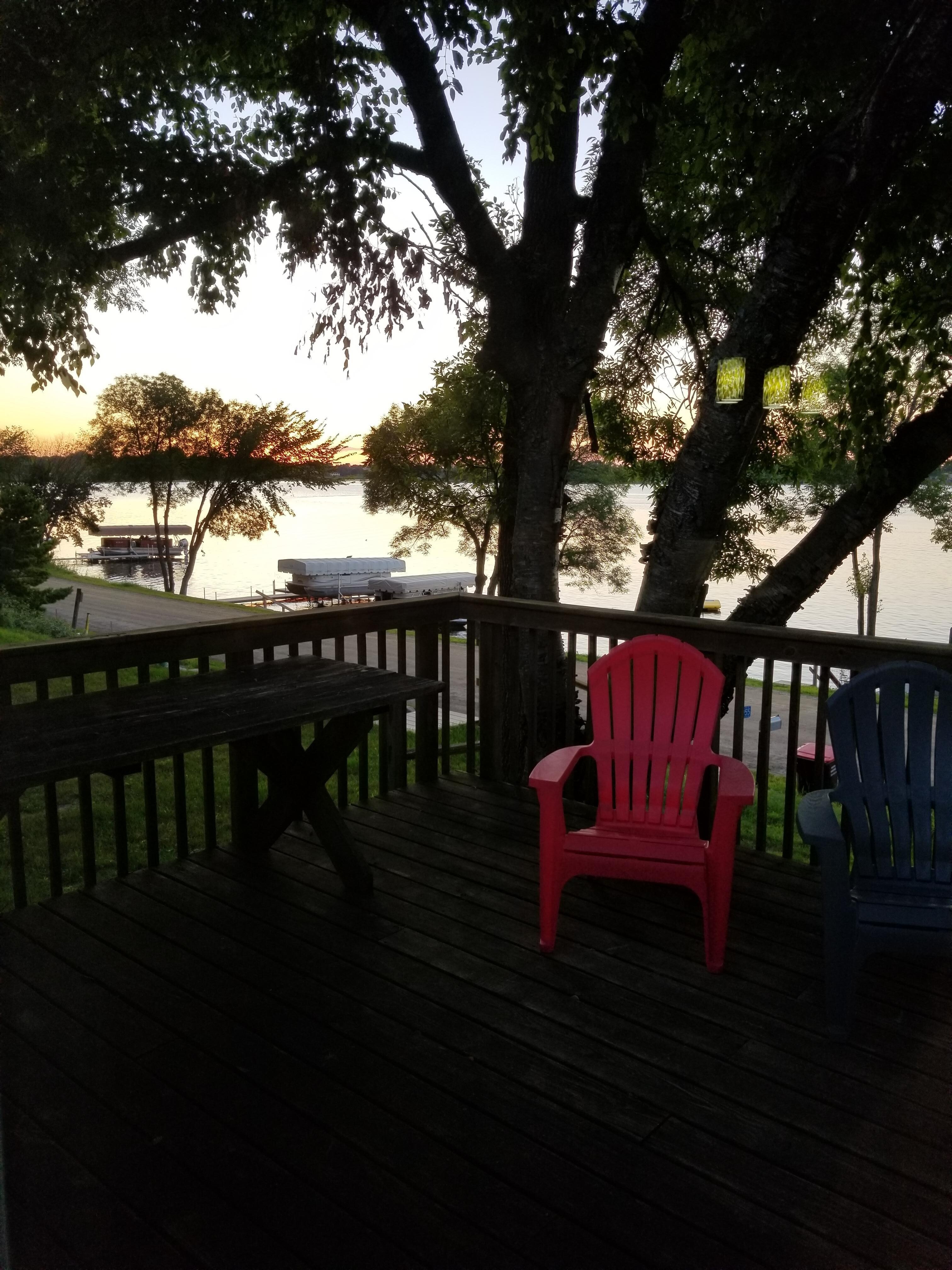 The cabin is across the street from the lake. Photos are a bit misleading. Deck furniture needs to be upgraded. There is a high top wood table and chairs that we refused to sit at. Desperately need to be painted or replaced.