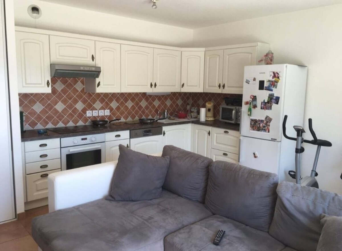 Grande piÚce à vivre avec ,Cuisine entiÚrement équipée tout confort et canapé d'angle avec TV grand écran