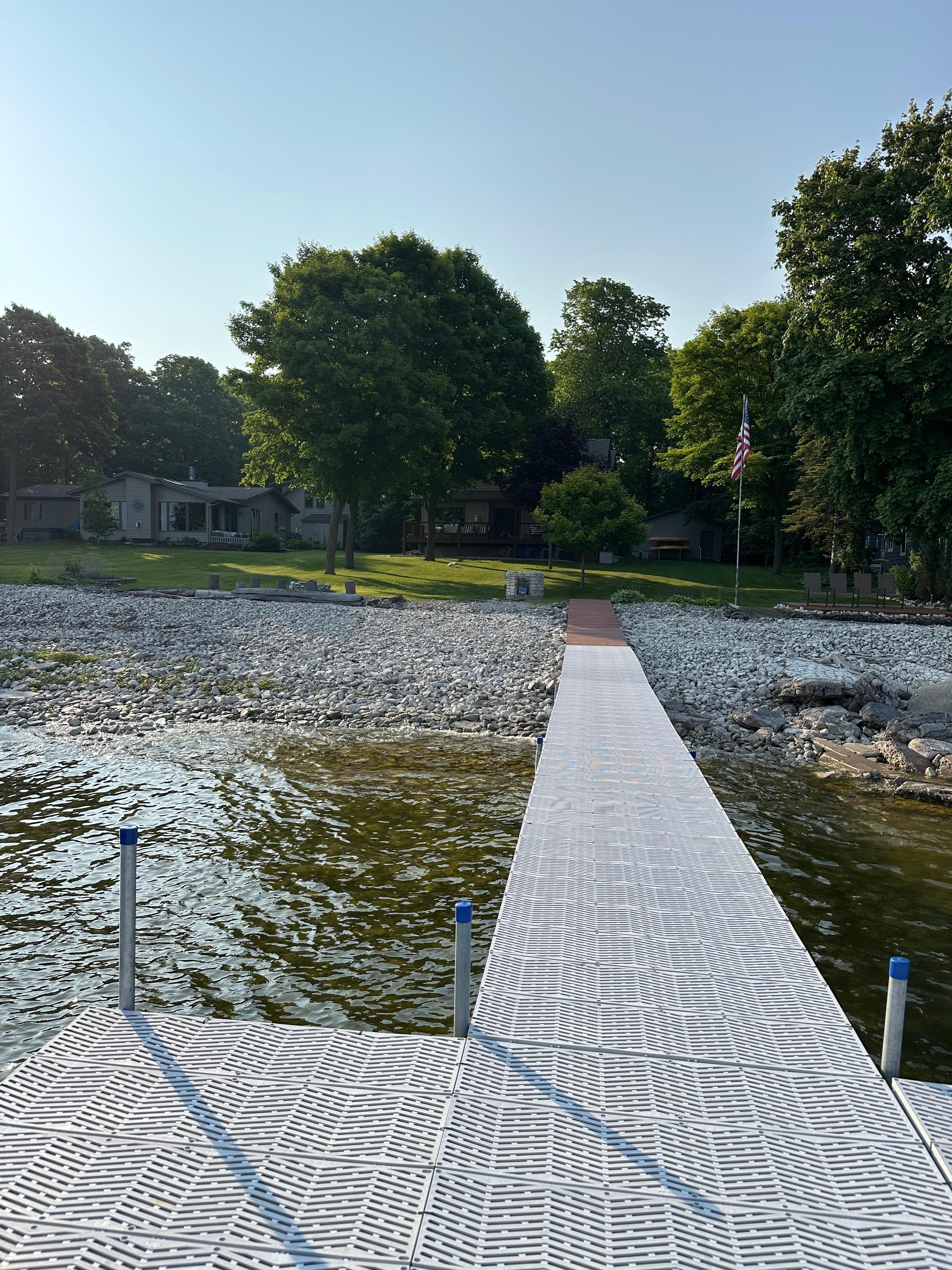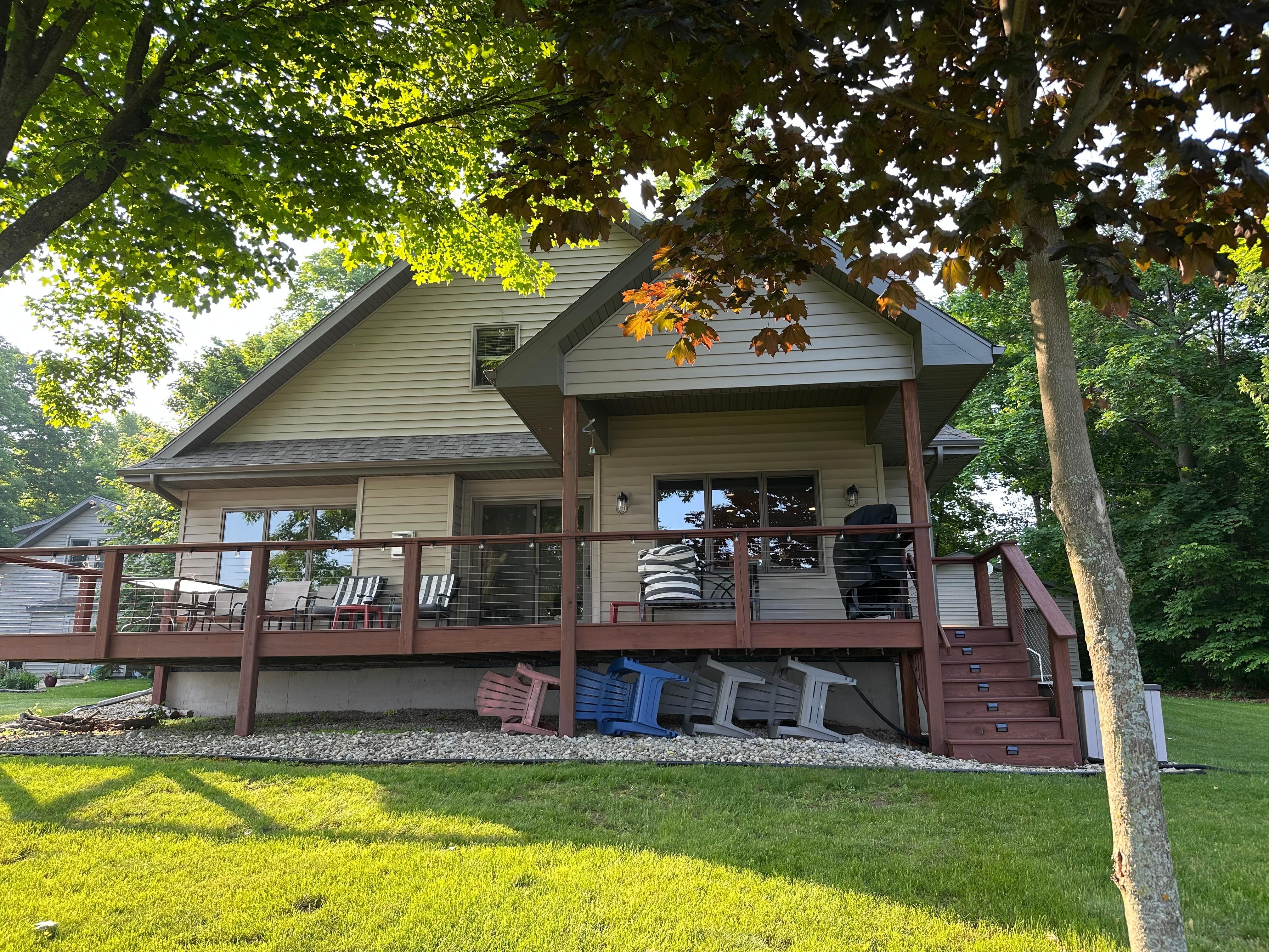 The Stone Duck has 3 bedrooms and 2 full bathrooms. The second floor features 2 bedrooms (one with queen bed and the second with two sets of bunk beds) and a full bath with tub. The main level has a large fully stocked kitchen including dishwasher and a dining table that seats 8. A living room with TV (with Roku stick for streaming shows and movies), sofa, love seat, comfy chair and puzzle/gaming table. One bedroom with a king bed. A full bathroom with a large standup shower. Step out the of the sliding glass door to the large deck with patio dining table and chairs, or relax on the outdoor love seat and chairs. If that's not enough, then walk down to the chairs on the water-side deck or enjoying roasting s'mores around the fire pit. Gas and charcoal grill are provided for all your BBQ needs. There is also a seasonal dock with a large area for sitting or for access to the water via the ladder (the dock is put in around June and taken out in September).