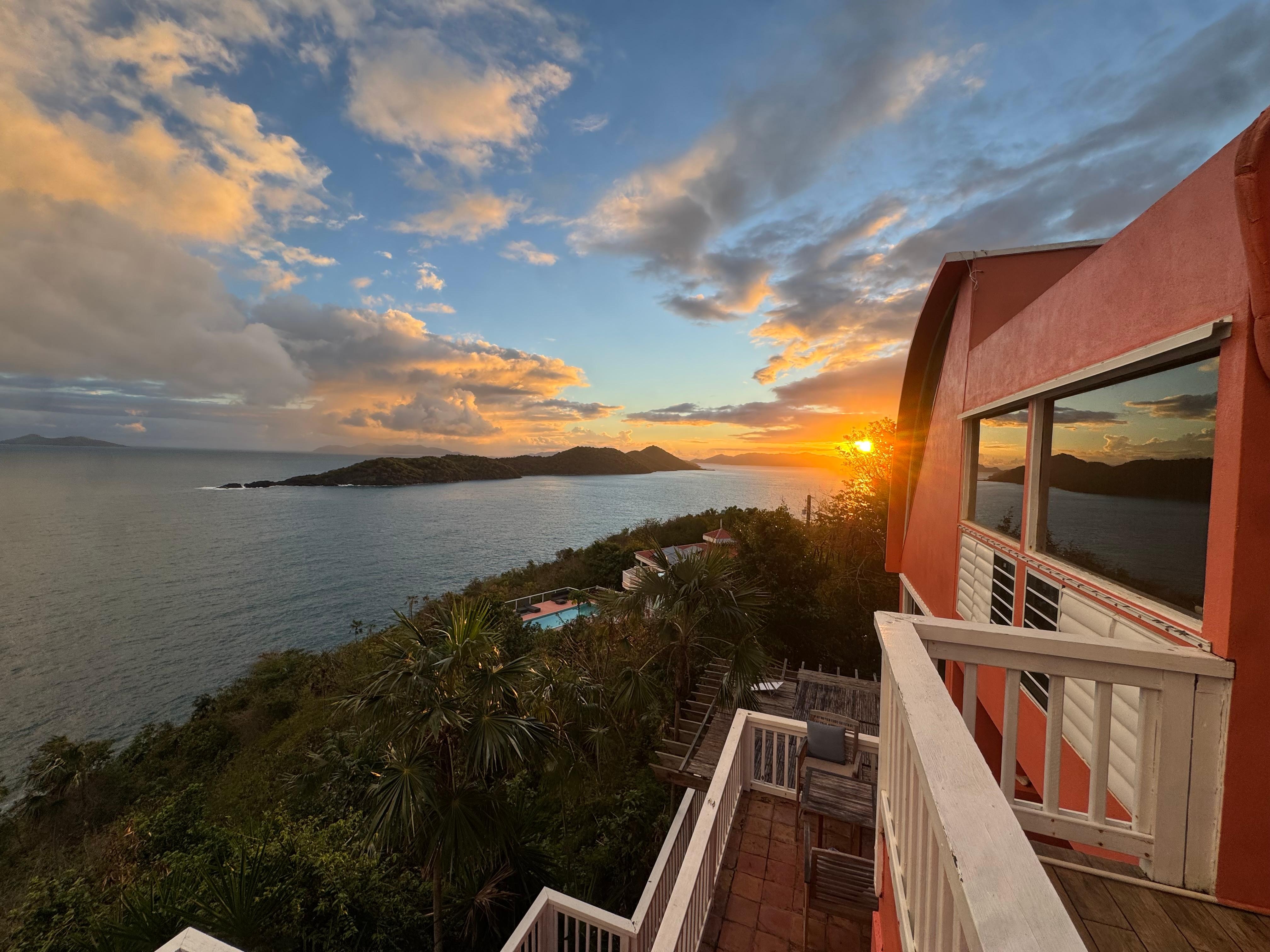 Quiet non-smoking villa near the end of Sunsi Point. Spacious neighborhood with 1+ acre lots. Low level of local traffic - one way in, one way out. Private compound with gated entry, off-street parking. Listen to the waves crash on the cliff 200 feet below. Enjoy constant trade winds from the east. Great water views from every bedroom. Relax for a drink in the great room with floor to ceiling panoramic views of the Atlantic and nearby islands. Take a dip in the plunge pool to cool off. Lounge on the sun deck or toast the sunset as you float away in your hammock, from the upper deck. Modernized split system A/C in great room and each bedroom. 30 foot curved great room ceiling. Ceiling fans in all rooms. Interior walls renovated through-out with quality cypress workmanship. Oak, granite, quartz, and stainless steel kitchen with island & dishwasher. Walk-in closet in master suite. New slate & hardwood floors on first level. New tile on upper level, accessed by spiral staircase.