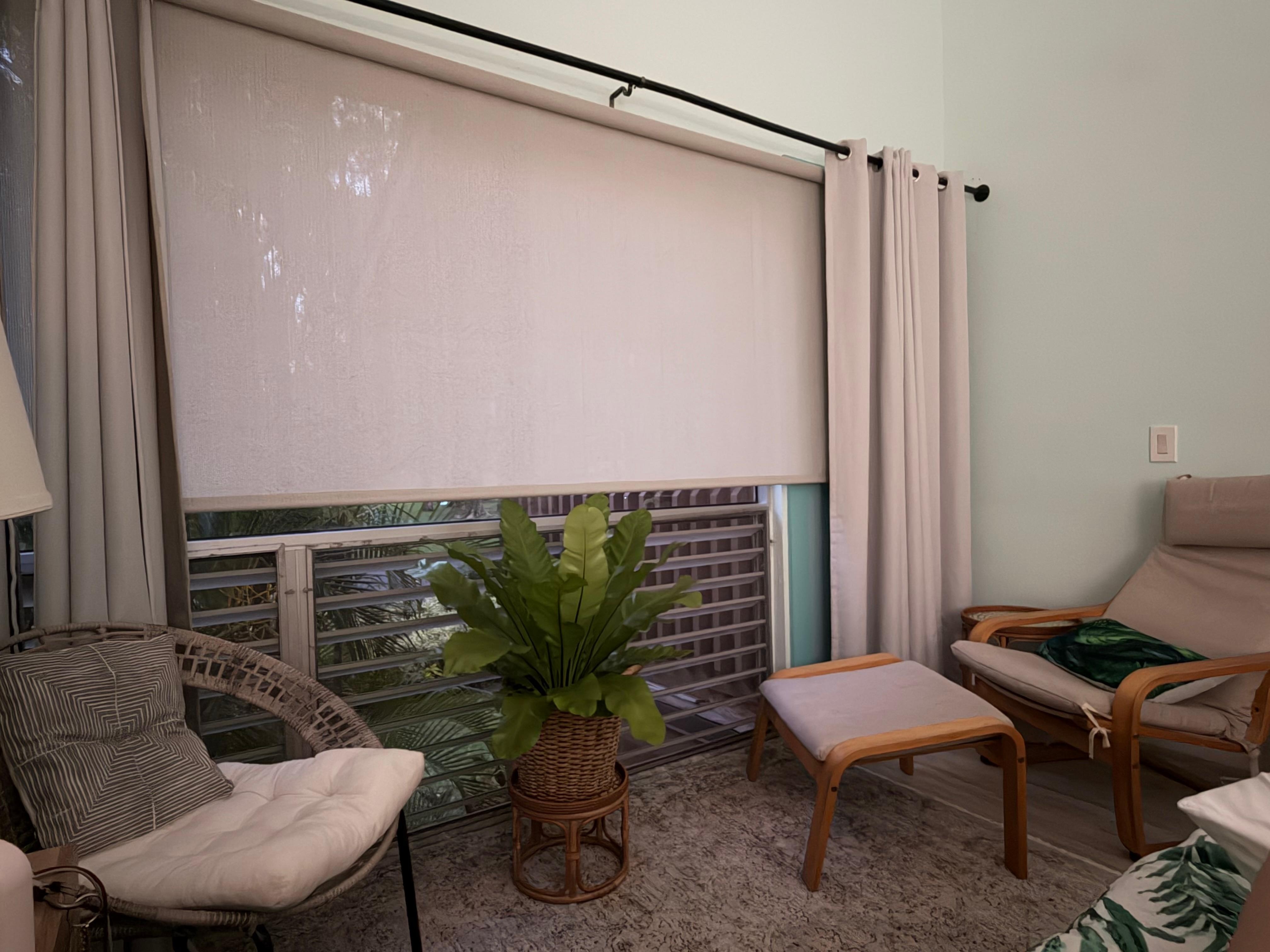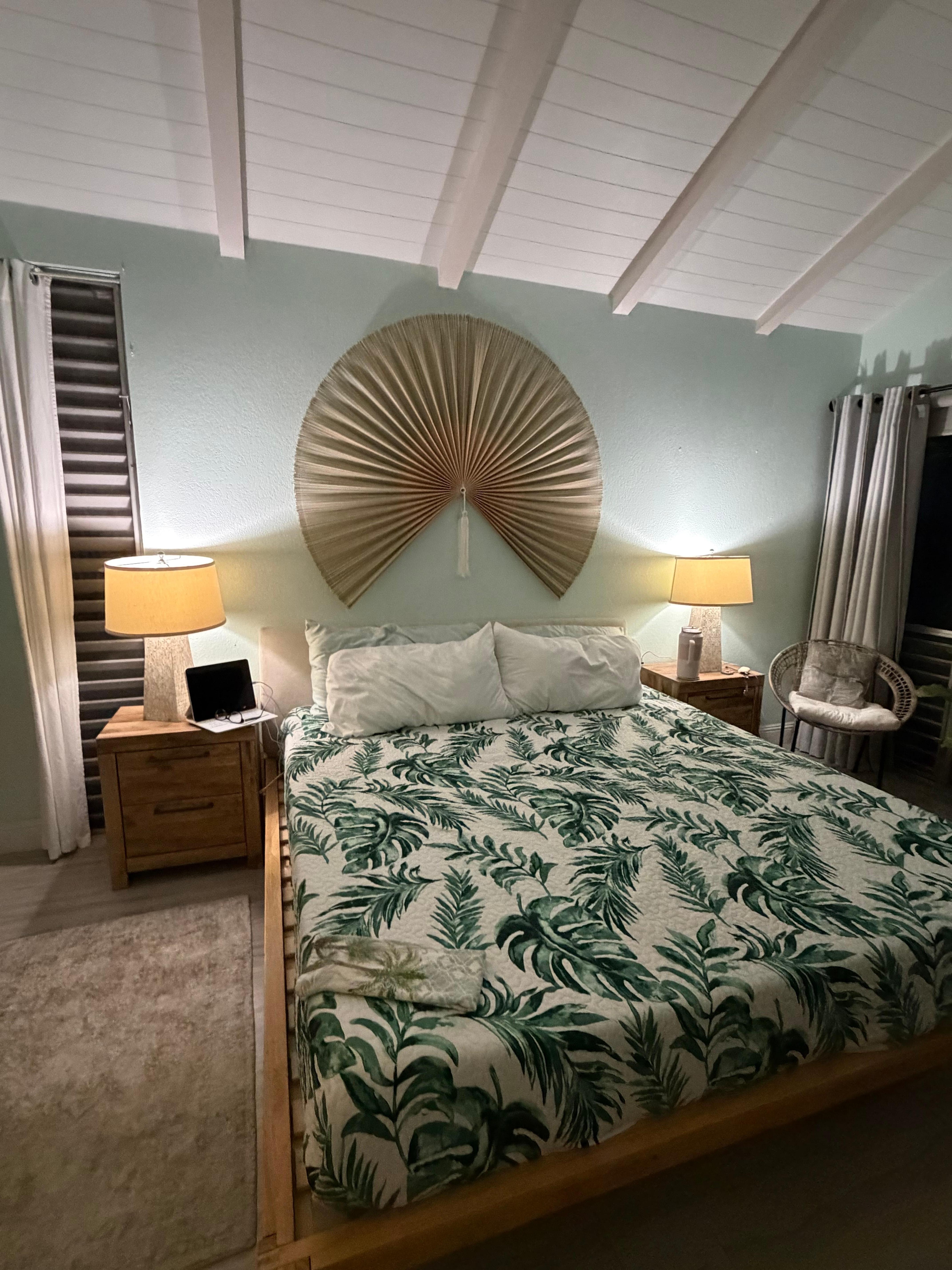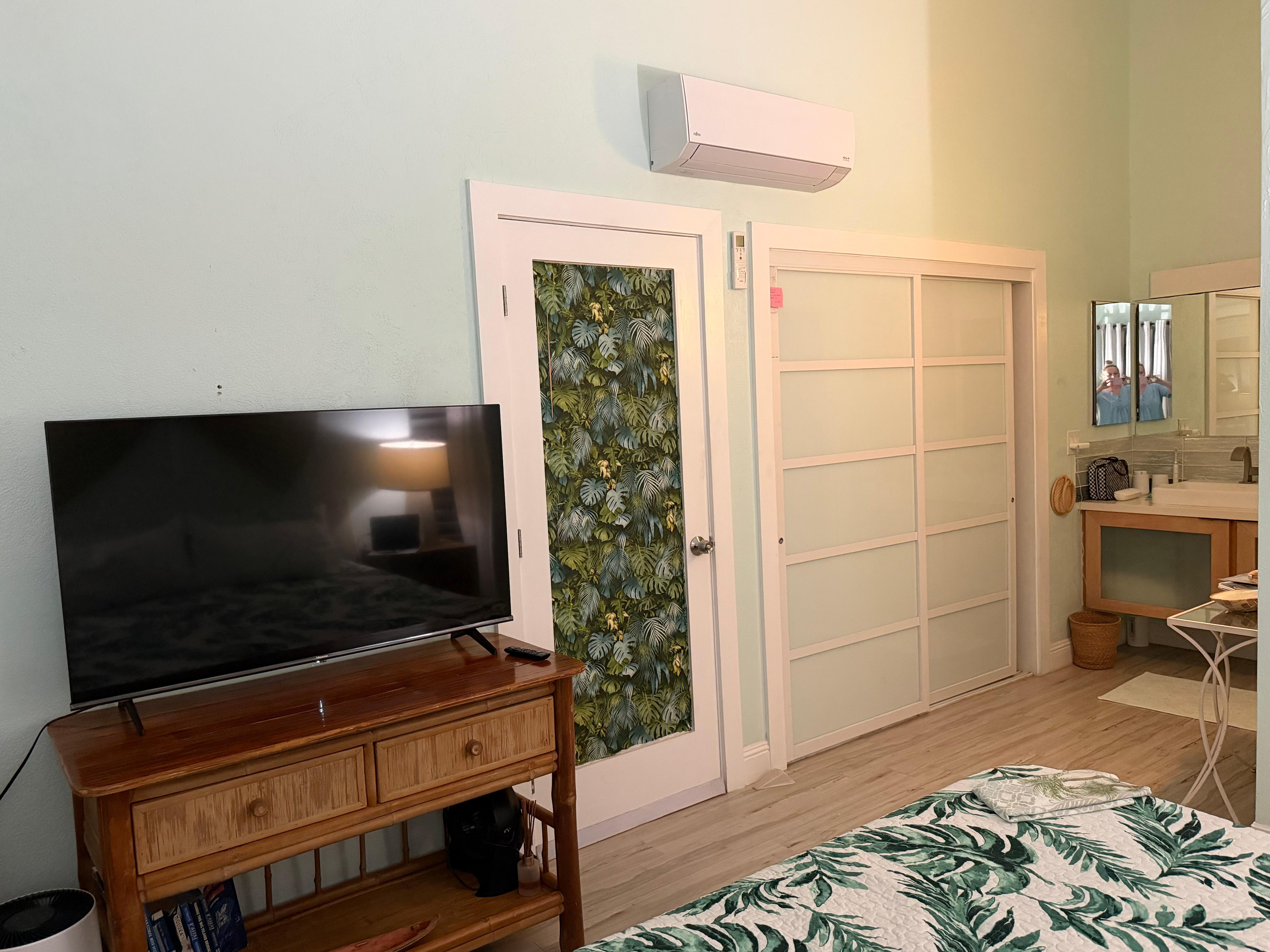 The primary bedroom has central air conditioning and black out curtains enabling you to close off the world outside after a day in the tropical warmth. There is a large smart television, a comfortable king size bed and a work space as well.