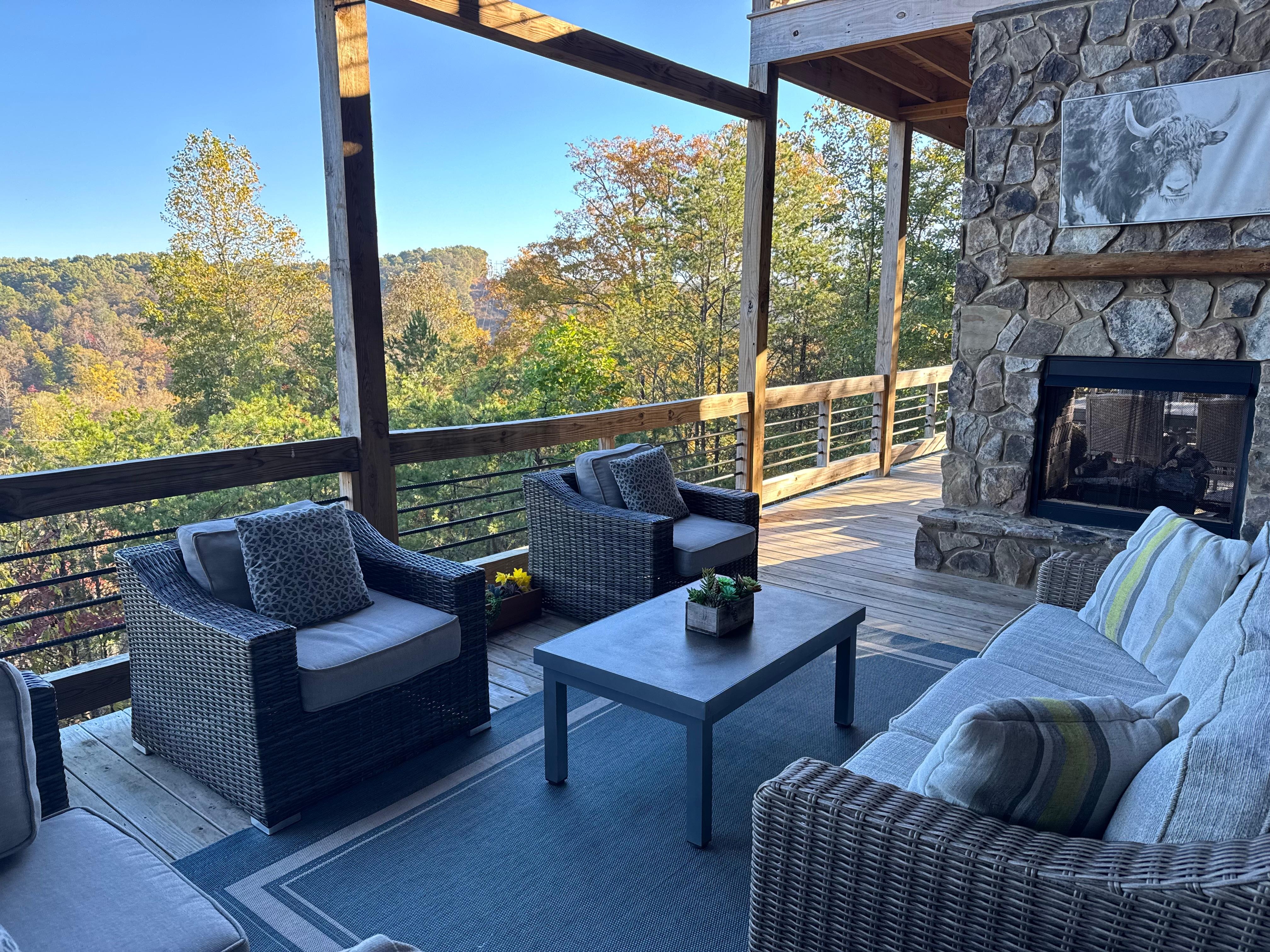 Outdoor - covered front porch; main level covered deck, patio table seats 6, gas grill, rug, patio sofa, chairs, stone gas fireplace, coffee table, rug, patio swivel chairs, 2 ceiling fans; upstairs deck, 2 patio sofas, rug; second upstairs deck, patio sofa, 4 patio chairs, coffee table, rug, ceiling fan; downstairs deck, hot tub seats 6, 2 patio sofas, 2 patio love seats, 4 patio chairs, foot rests, coffee tables, rug, ceiling fans; fire pit with 6 king size Adirondack chairs