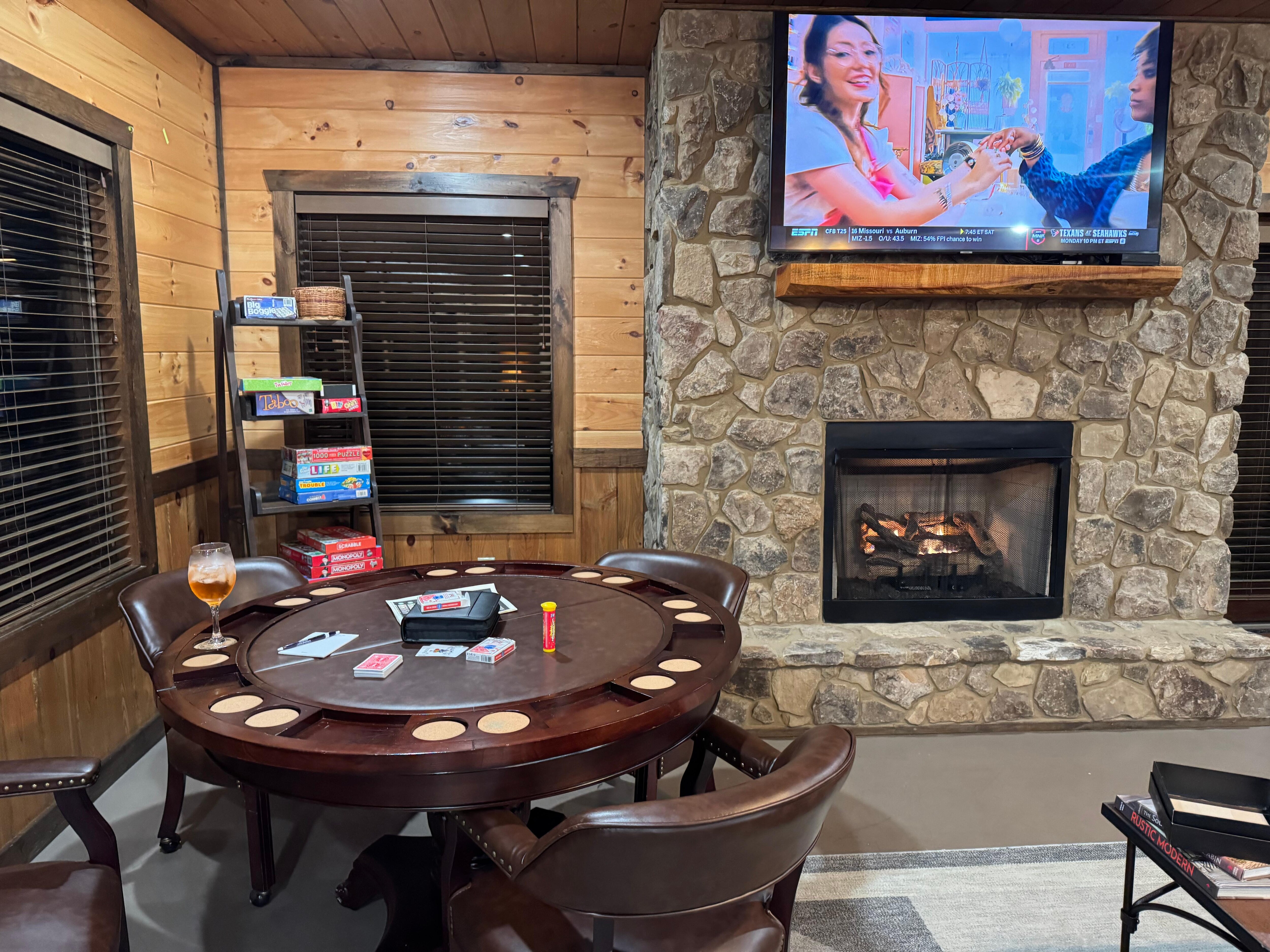 Game Room - pool table, pool table light, poker table, 4 chairs, 2 stools, board games, leather sofa, stone gas fireplace, 65â Smart TV, 2 chairs, coffee table, rug, ceiling fan, wet bar seats 3, granite countertops, mini refrigerator
