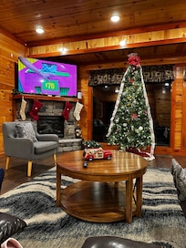 The living room of Smoky Pool Lodge was made for family and friends to gather, chat, and enjoy the beauty and peace of the Great Smoky Mountains. Here you'll gather to relax on the plush sofas, easily grab snacks from the kitchen nearby, stay cozy by the fireplace, play a board game with the kids on the coffee table, and watch movies on the big screen TV. As you unwind, you can soak in the incredible mountain views through the trio of windows on either side of the fireplace.