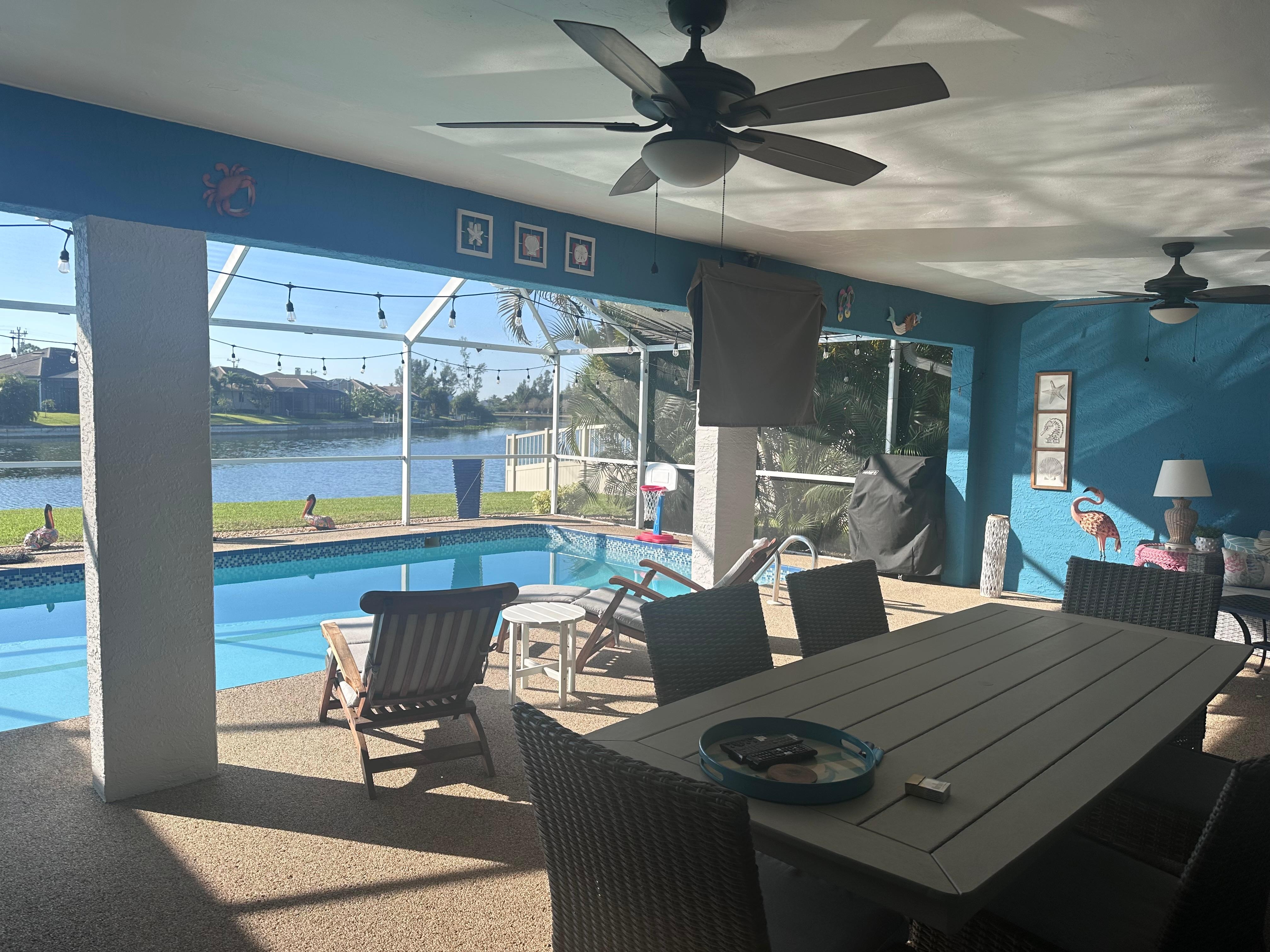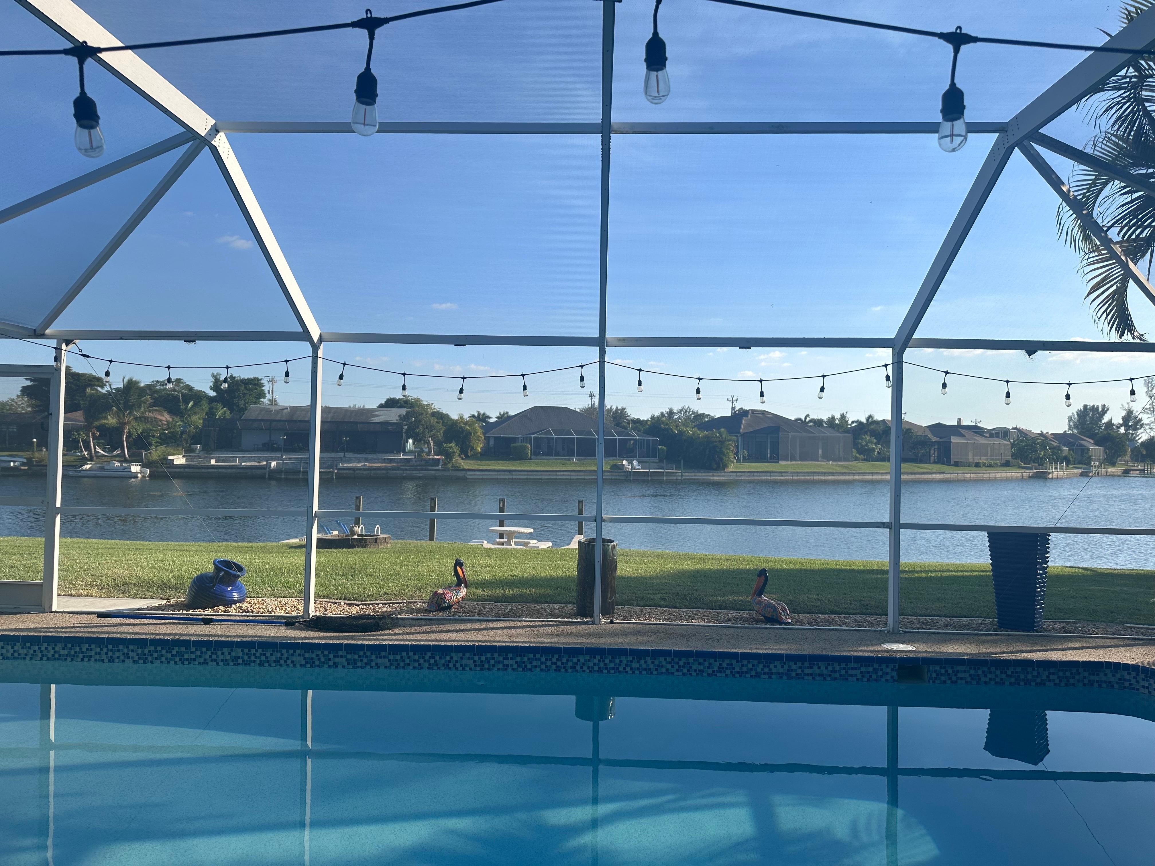 Welcome to your perfect Southwest Florida getaway â a haven of comfort, luxury, and serenity. Experience the ultimate in sunny paradise living at our immaculate retreat in Cape Coral! Nestled in a serene neighborhood, this exceptional home offers a tranquil escape with every amenity for your family's enjoyment. Bask in the warmth of our southern exposure home and savor breathtaking sunsets over intersecting canals. Our property boasts a year-round heated swimming pool, allowing you to indulge in poolside relaxation any time you desire. As you gaze upon the picturesque canal views, we invite you to embark on aquatic adventures with our complimentary kayaks, perfect for exploring the waterways at your leisure. Step into a sun-drenched haven, where cleanliness and comfort reign supreme. Inside, discover a chef's dream kitchen fully equipped, adorned with elegant granite countertops and a spacious island. The entire home has been tastefully furnished with new decor, creating an inviting ambiance for your stay. Five TVs ensure entertainment options for everyone, while Wi-Fi connectivity keeps you connected. The kitchen's open layout provides views of the pool and expansive lanai, where you can savor outdoor meals in peace and privacy. For your added convenience, our garage is available for your use, featuring two bicycles for your enjoyment as you explore the neighborhood. With stores, shopping, restaurants, parks, and beaches just moments away, you'll relish the convenience of our prime location. Revel in the tranquility of this stunning neighborhood, nestled amidst magnificent surroundings. Life doesn't get any better than this! Book your stay now and make unforgettable memories in our sunny paradise home.