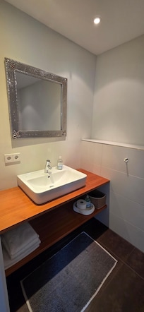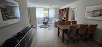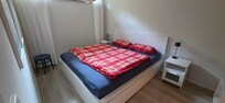 La salle de bain a une douche, le salon-salle Ă manger est nouveau et moderne avec table Ă manger, chaises, tĂ©lĂ©vision Ă Ă©cran plat, et grand canapĂ©-lit confortablement meublĂ©es. Dans la chambre Ă coucher est un, armoire et un lit double. La cuisine est Ă©quipĂ©e de rĂ©frigĂ©rateur, lave-vaisselle, cuisiniĂšre, et la vaisselle, verres, casseroles, bouilloire, cafetiĂšre. u. V. M. Ă©quipĂ©e. L'appartement dispose d'une entrĂ©e sĂ©parĂ©e et un parking. Le jardin et la terrasse peuvent ĂȘtre partagĂ©s.
