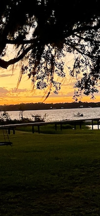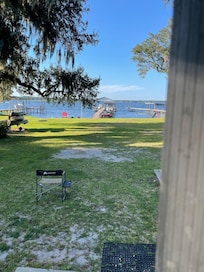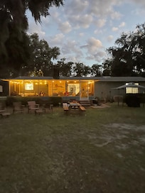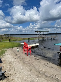 Lakefront home with new and improved dock on amazing spring fed Lake Kerr. Perfect area for swimming, fishing and boating. Within a few miles of hiking trails, springs for kayaking and ATV/UTV trails. Screened porch to enjoy your morning coffee and a fire pit for roasting marshmallows. 3 kayaks and a paddleboard for guest use. Sandy beach for kids to play on and room on dock to anchor your own boat or you can beach your boat right on the beach. Covered deck/dock with lighting and fans. Also had open section of dock to sunbathe. Ring camera on front porch for added security. Plenty of yard space for cornhole (provided) and other games. Boat ramp is less than 1 mile from house. Salt Springs boat ramp and swimming area is within 2 miles from house which also leads into Lake George and other beautiful springs for swimming and snorkeling. Comfortably sleeps 8 in beds. Blow up mattresses available upon request.