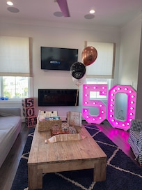 Step inside and discover a thoughtfully designed, open-concept living space with luxurious finishes and a welcoming atmosphere. The top floor, home to the main living area, offers panoramic views of Galvestonâs narrow strip and is perfect for both daydreaming and stargazing. A large, comfortable seating area surrounds a 55â television, while the adjacent dining space easily accommodates eight guests at a stylish table. The fully updated kitchen is a culinary delight, featuring GE appliances, custom cabinetry, quartz countertops, a 14-foot serving bar, a farmhouse sink, and a chic glass tile backsplash. Also included is cable television and limited Wi-Fi for guest convenience.