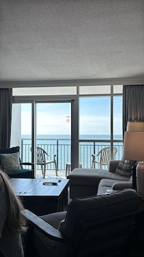 Relax in comfort in the gracefully furnished family room while viewing breathtaking sunrises from the wall to wall, floor to ceiling windows. Enjoy the salty air on the attached private balcony as you listen to the waves gently crashing onto the white sandy beach. Some of the amenities include a large HD TV, comfortable seating, and free Wi-Fi.