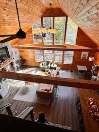 Open concept design living room is the heartbeat of the home. Relax by the fireplace after a day of adventuring through the gorgeous mountains or the many nearby attractions.