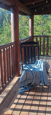 Step onto the wrap around porch and take in Mother Nature at her finest with the beautiful views. We enjoy relaxing in the rocking chairs while taking in the breeze through the trees and listening to the birds. This view of the wilderness also includes a hot tub to help melt your worries away, propane grill for delicious BBQ dinners and string lights that create a magical atmosphere in the evenings.