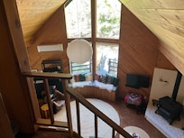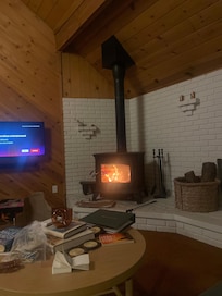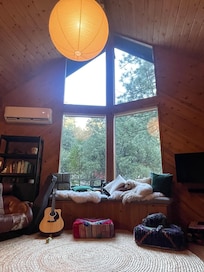 The living room is defined by full-height windows over an upholstered window seat, brick hearth with wood-burning stove, and a vintage Percival Lafer armchair. Enjoy the sights and sounds of the forest, or unwind in front of the 42â Roku TV with Sonos surround sound for either music or tv.