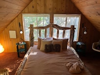 Built in 1979, The Dusk House is a two-story A-frame, with a main level living room, bedroom, kitchen, full bath, and dining area, topped by a dramatic sleeping loft overlooking the living area.