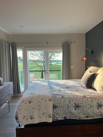 The downstairs bedroom has a private deck, huge TV for movie views and is a flexible space for working/sleeping space. It is equipped with a custom queen murphy bed for a couple.