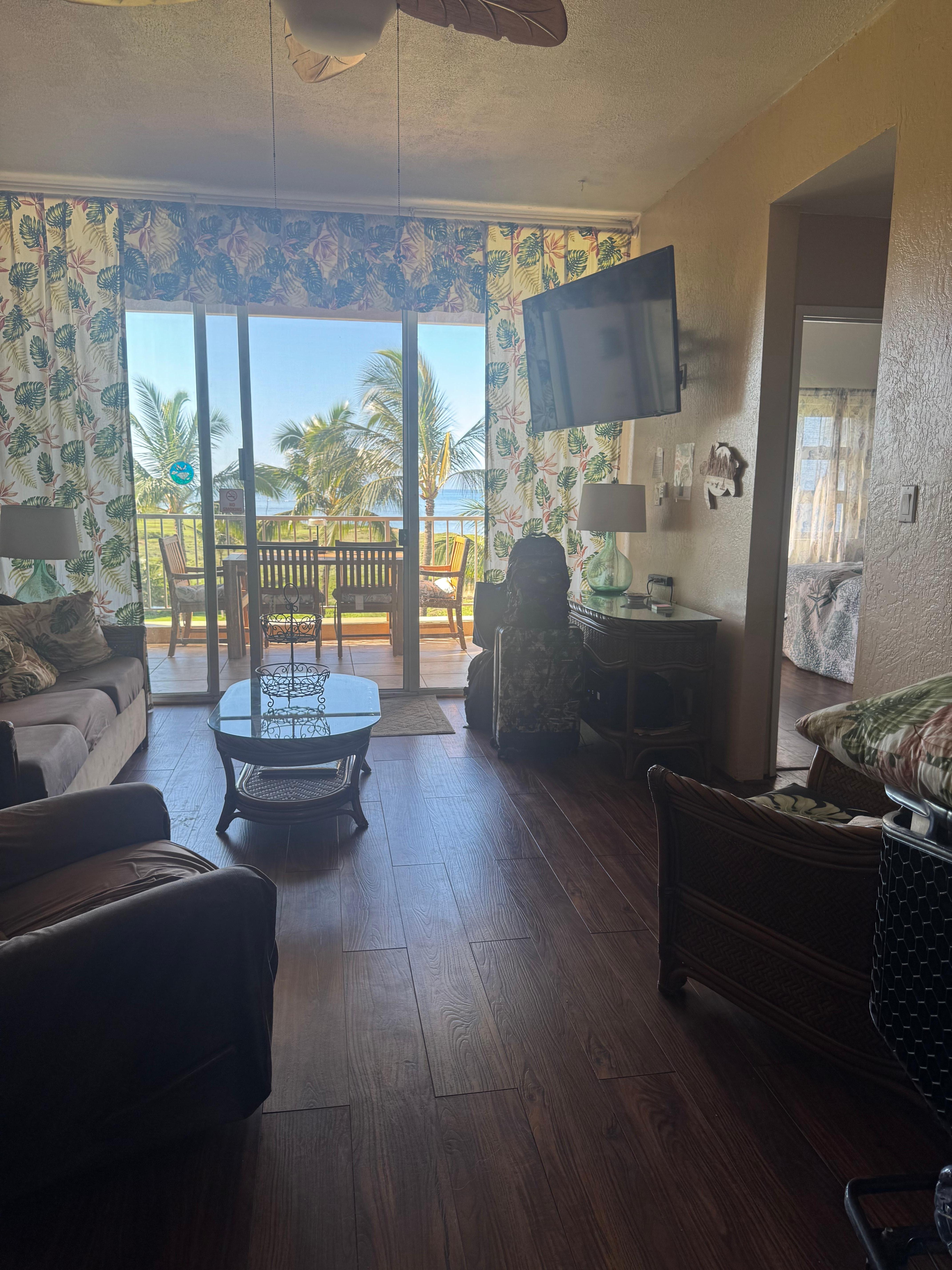 Il y a une vue spectaculaire sur l'océan et le rivage de la véranda (balcon extérieur). La vue comprend les pentes sud-ouest du cratÚre Haleakala, trois ßles et probablement des baleines à bosse nageant le long de la cÎte ouest de Maui entre décembre et mai.