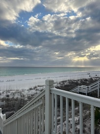 An ocean-view home steps away from the beach located in the gated community of Carillon Beach. This home has 4 king bedrooms with an open-concept kitchen, living room, and dining room on the second floor to enjoy breathtaking views of the Gulf of Mexico. The home is reverse living. 3 bedrooms and 2 full bathrooms with a den are downstairs and upstairs includes the master suite, kitchen, dining room, living room, and a half bath. Seasonal lounge chairs with umbrellas will be available located on the beach. Enjoy the safety of riding bikes or walking around all of Carillon's amenities. Two blocks away from the marketplace that includes the following businesses and attractions: Lake Powell Pizza, Our Little Beach Cafe, Salon Baliage & Spa, Paradise Fitness Gym, Shipwreck (general beach store), Salty Bottle wine shop, Panama City Coffee Co, Village Green space that provides seasonal free concerts and movie nights, and a chapel service. Additional amenities include 3 pools (2 heated off-season), a tennis court, pickleball courts, a basketball court, a playground, and a lush professional landscape promenade. You can rent golf carts through Coastal Cars & Carts and additional bikes with the Shipwreck General Store.