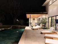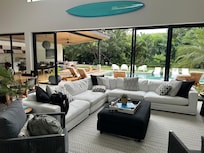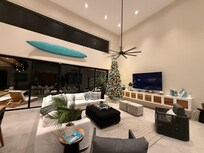 Casa Ola Aloha is a 4 bedroom, 4 bathroom 3000 sq ft is a tropical modern beauty! Clean modern lines, customized furniture, and a palette of bright tropical colors bring this home to life. All of the internal spaces are air-conditioned with individual mini-split units allowing customized cooling throughout the home. The furniture from the huge pivoting wooden front door to the incredible feature beds, wooden cabinets, and dining table has been customized to continue the tropical theme throughout. 30ft of glass sliding doors open the main house to an incredible private oasis setting with a cooling pool as the central feature, adjacent to the pool a luxurious 365 sqft thatched palm rancho offers the ultimate poolside retreat complete with outdoor kitchen, BBQ, dining, lounge and of course the ultimate hammock setting for your afternoon siesta!