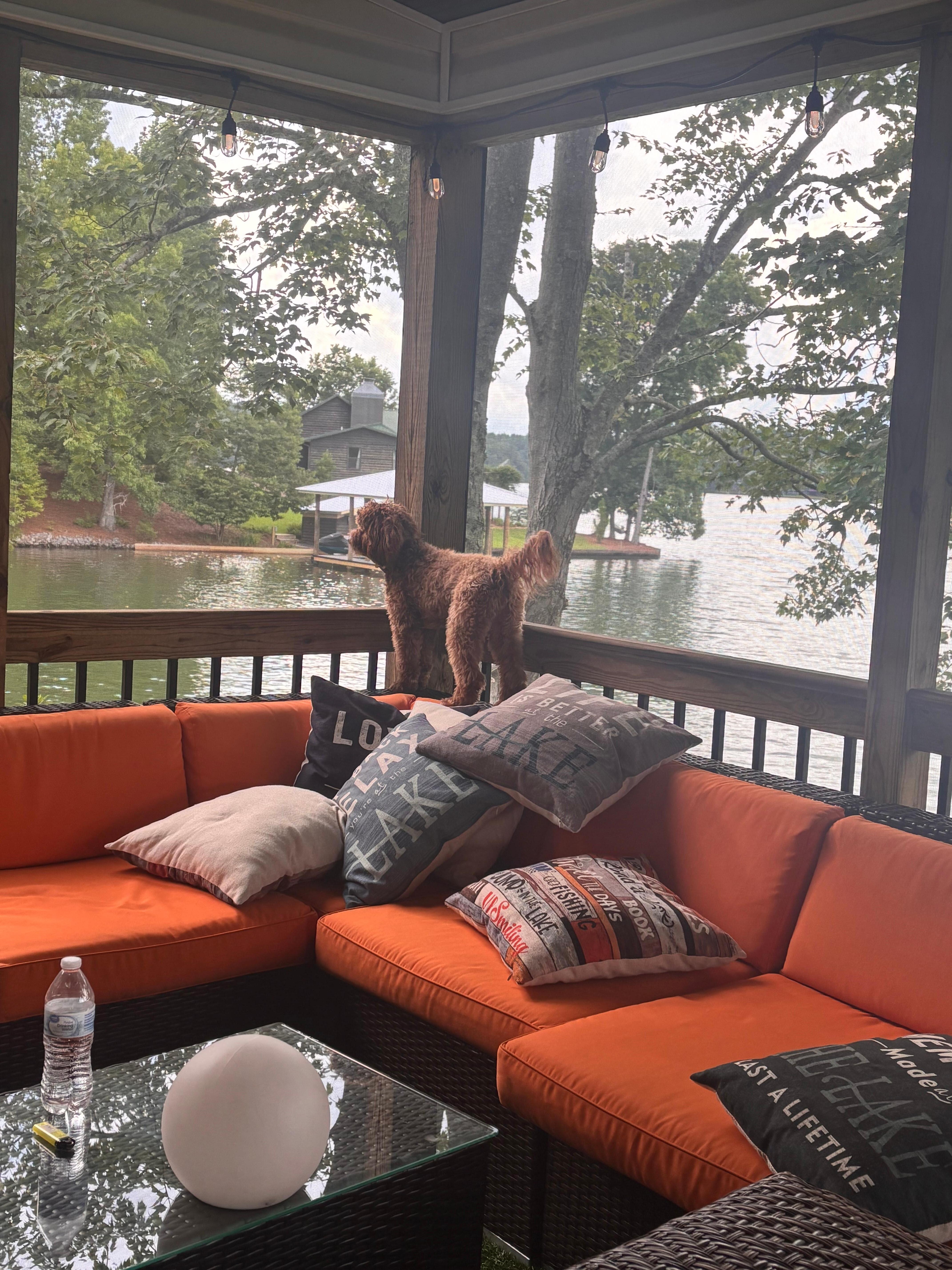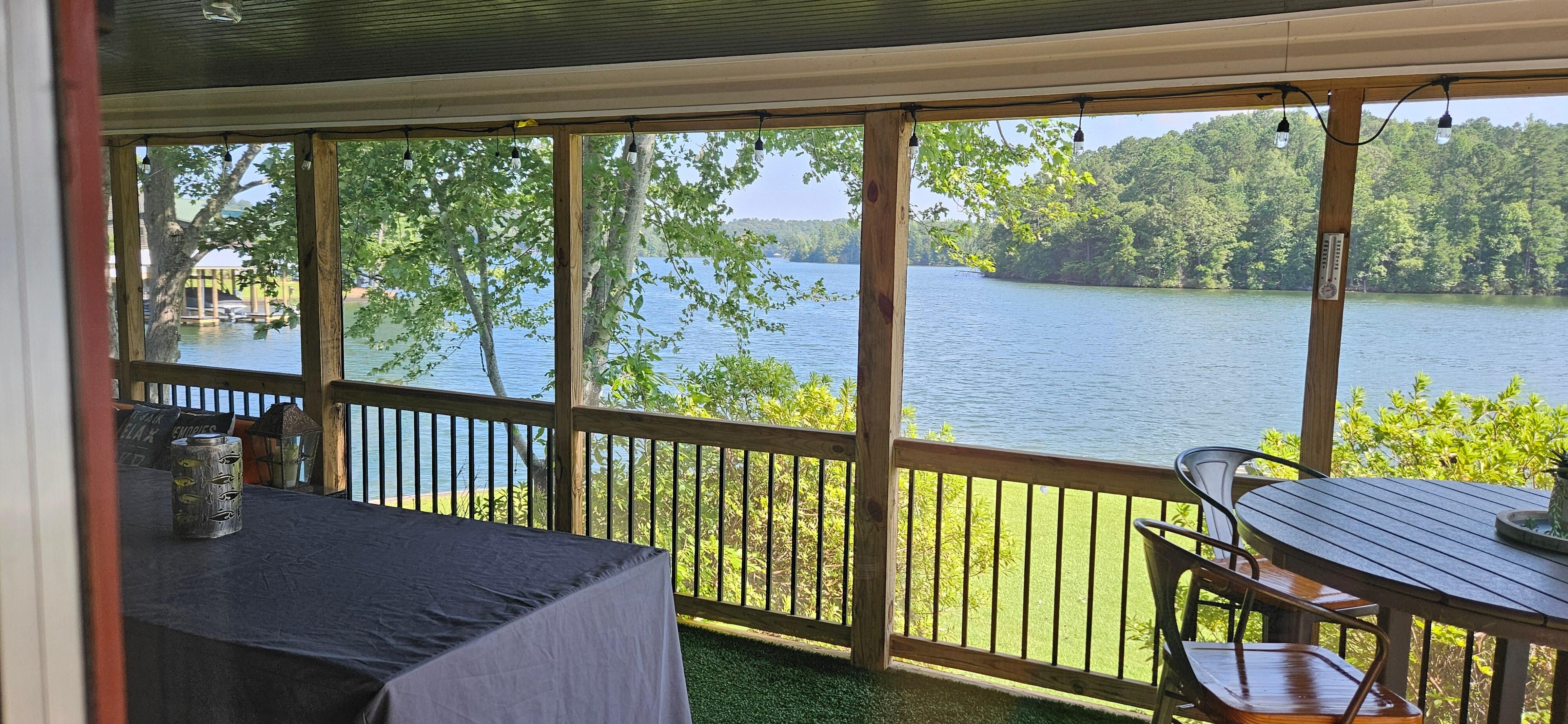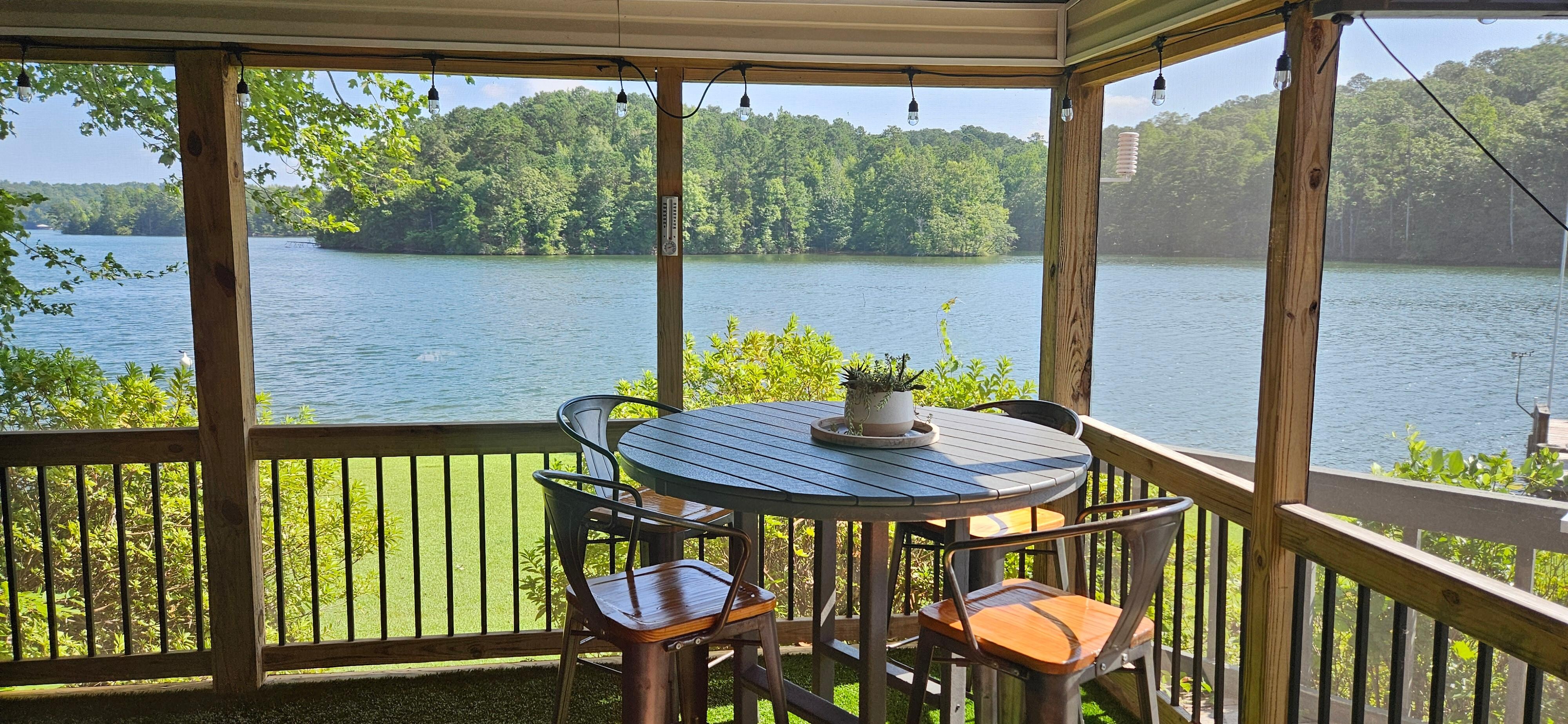 One of the best spots in the house? The large screened-in porch overlooking the lake. This inviting space includes a cozy lounging area, a round table perfect for snacks or games, a large TV, and a shuffleboard table that doubles as a large-group dining table. Whether youâre sipping morning coffee, reading during a rainstorm, or sneaking in an afternoon nap, the porch is a guest favorite.