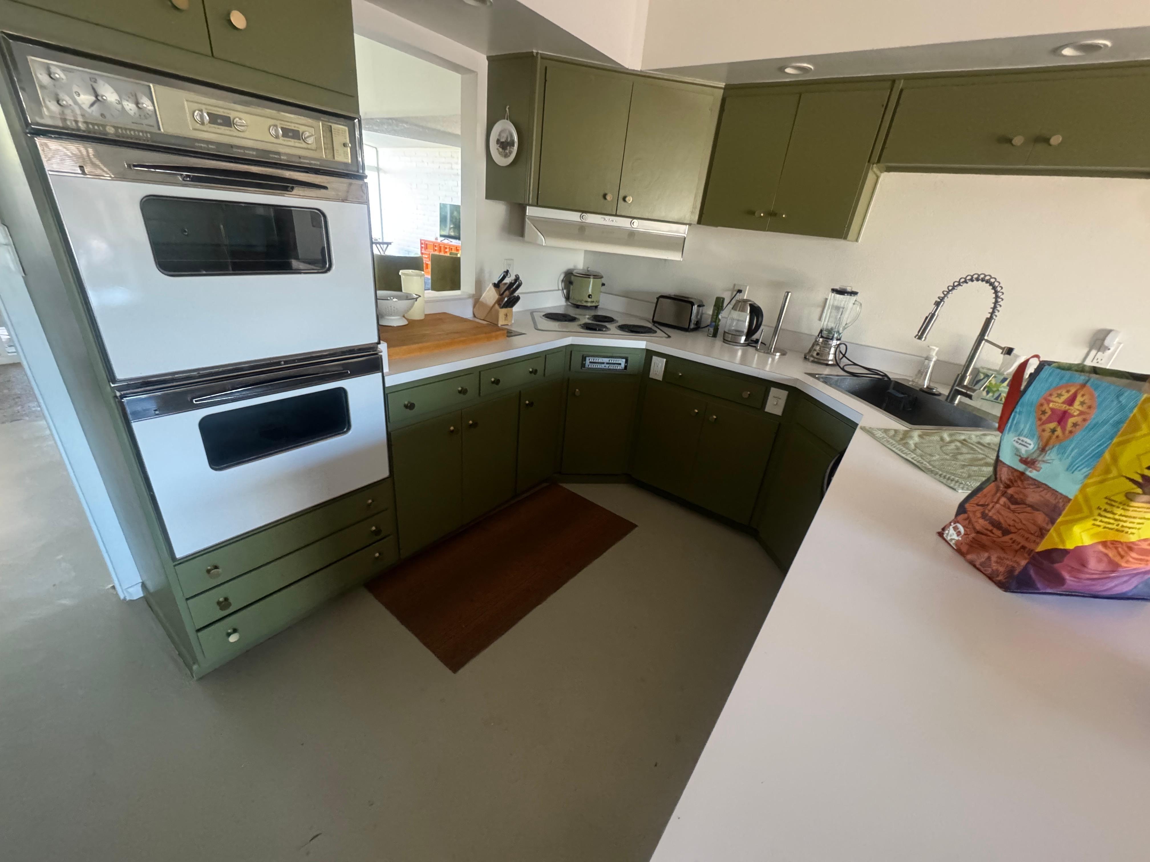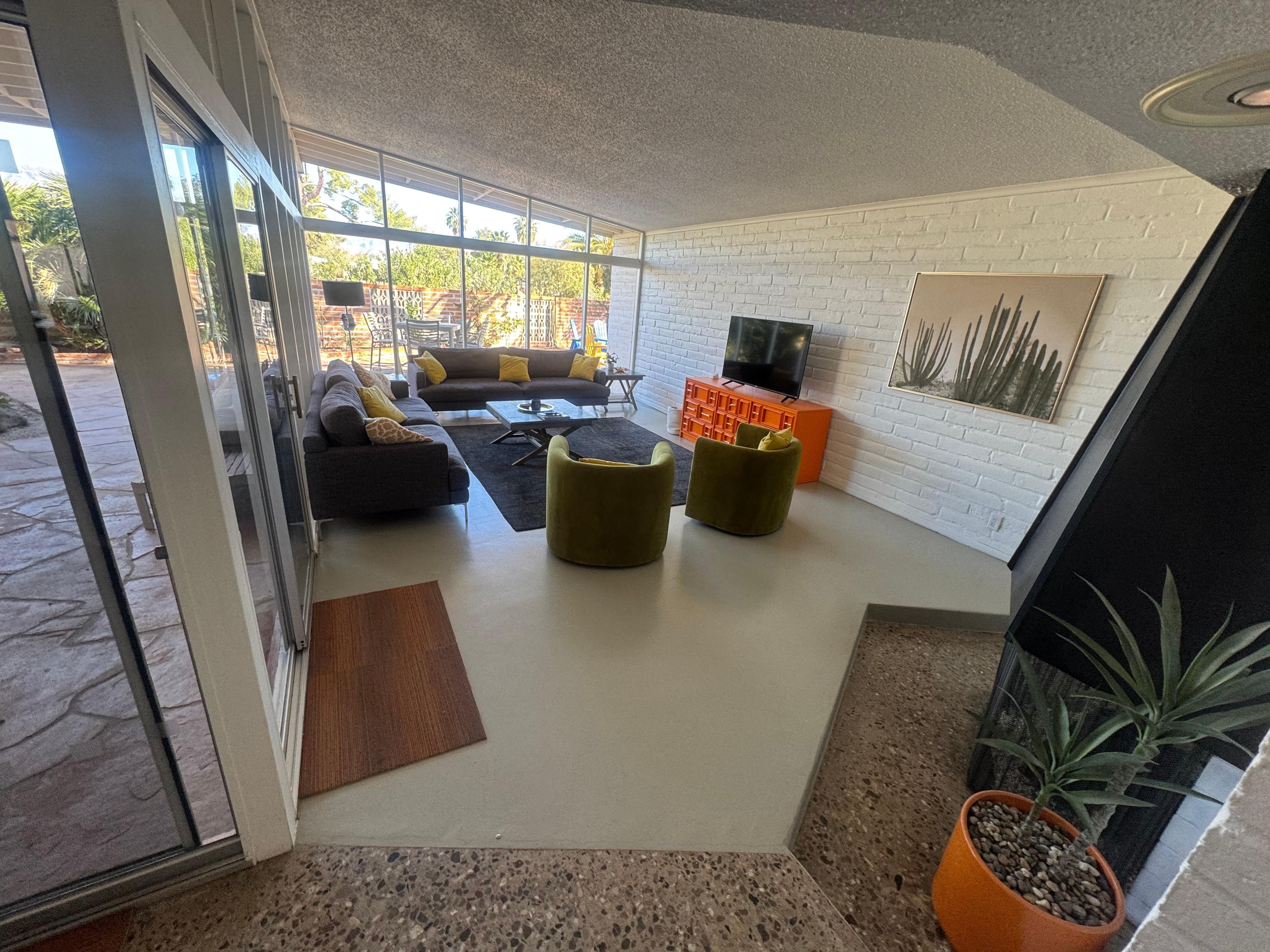 Super spacious house and nicely spread out for individual privacy. Master bedroom features walls of glass, patio access, king bed and ensuite bathroom with walk-in shower. Second bedroom has 1 queen bed, patio access and huge bonus room with desk. Front bedroom has a double bed with attached 1/2 bathroom. Formal dining room with walls of glass next to living room. Restored kitchen with original Nutone built in blender and GE double oven with Rotisserie and subzero refrigerator. Dining room off kitchen with glass slider to another patio. Laundry is off kitchen with side-by-side washer and dryer.