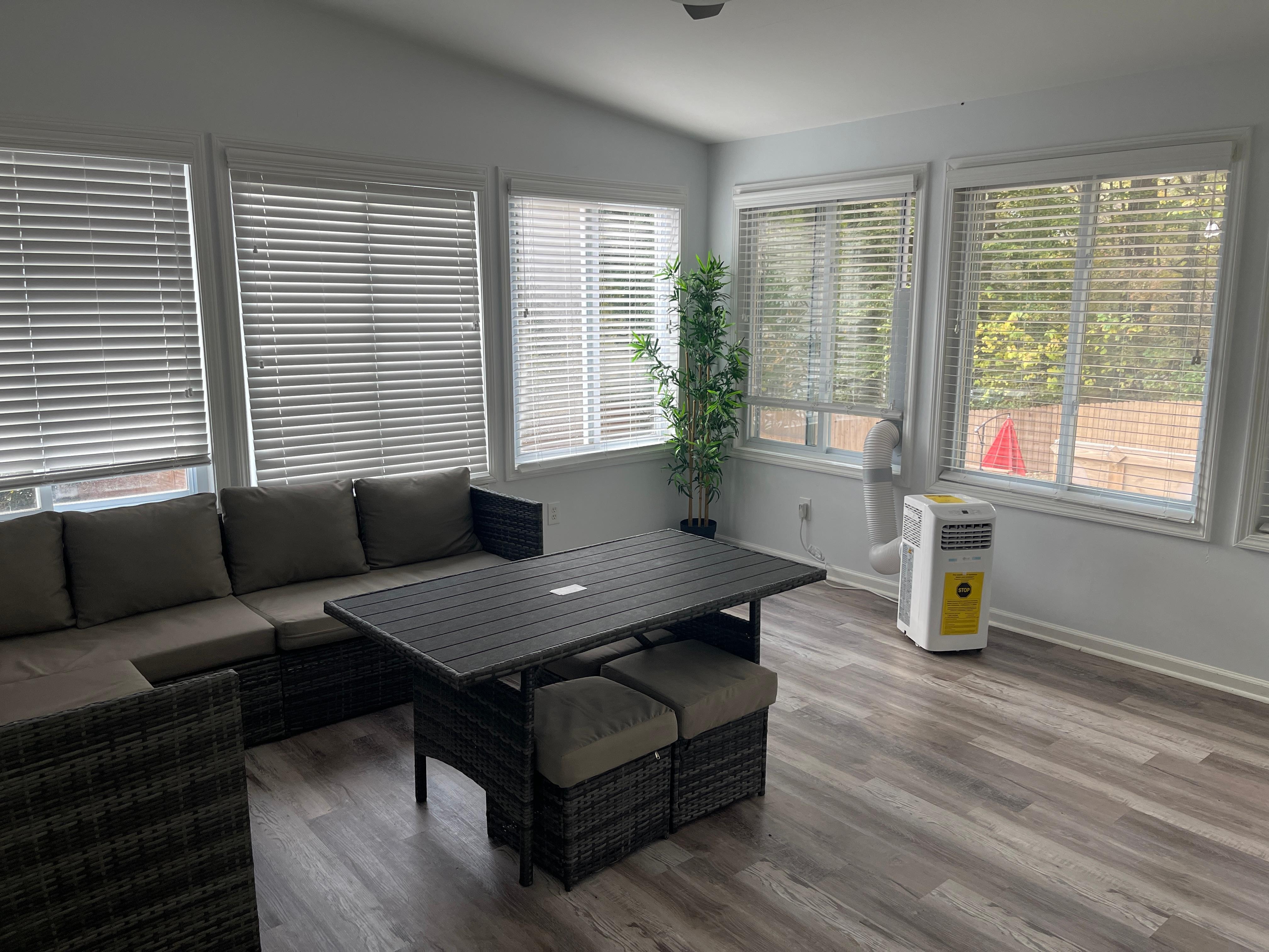1. The main level consists of a new open kitchen with new stainless-steel appliances and with 2 formal dining areas, a large open living room with TV an office area, a bright sunroom with access to and overlooking the entire backyard, a queen bedroom with TV, a double bunk bedroom with TV (both bunk beds have twin mattresses on top and full-size mattresses on the bottom), a full hallway bathroom (double sink vanity, combination tub/shower), and a large laundry room with 2 sets of washers & dryers.